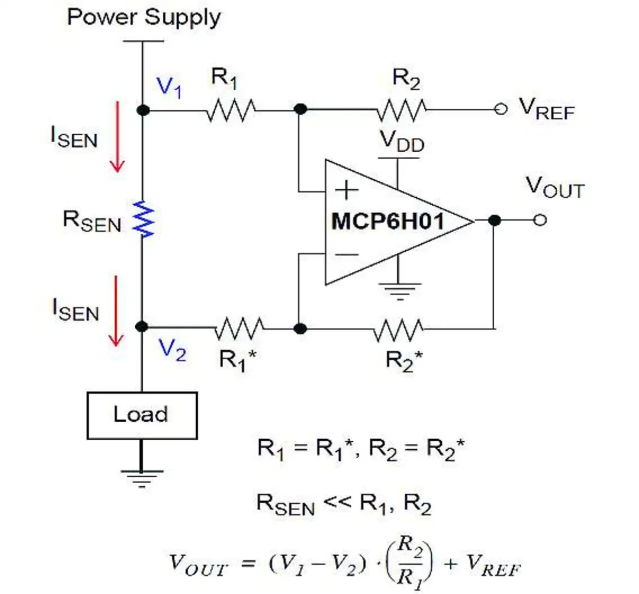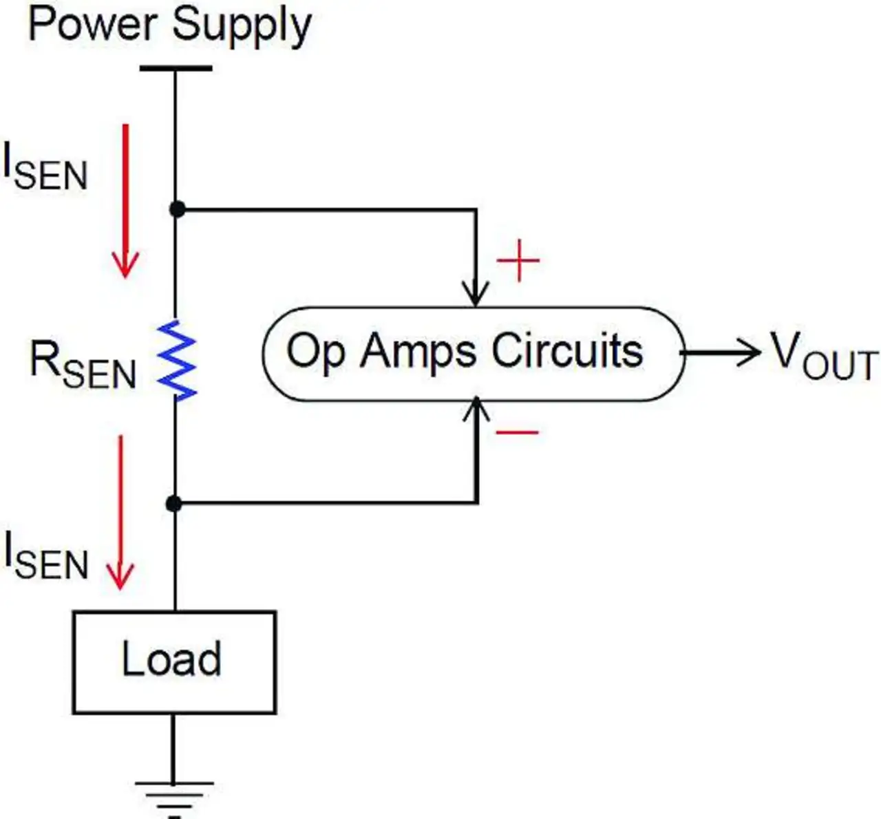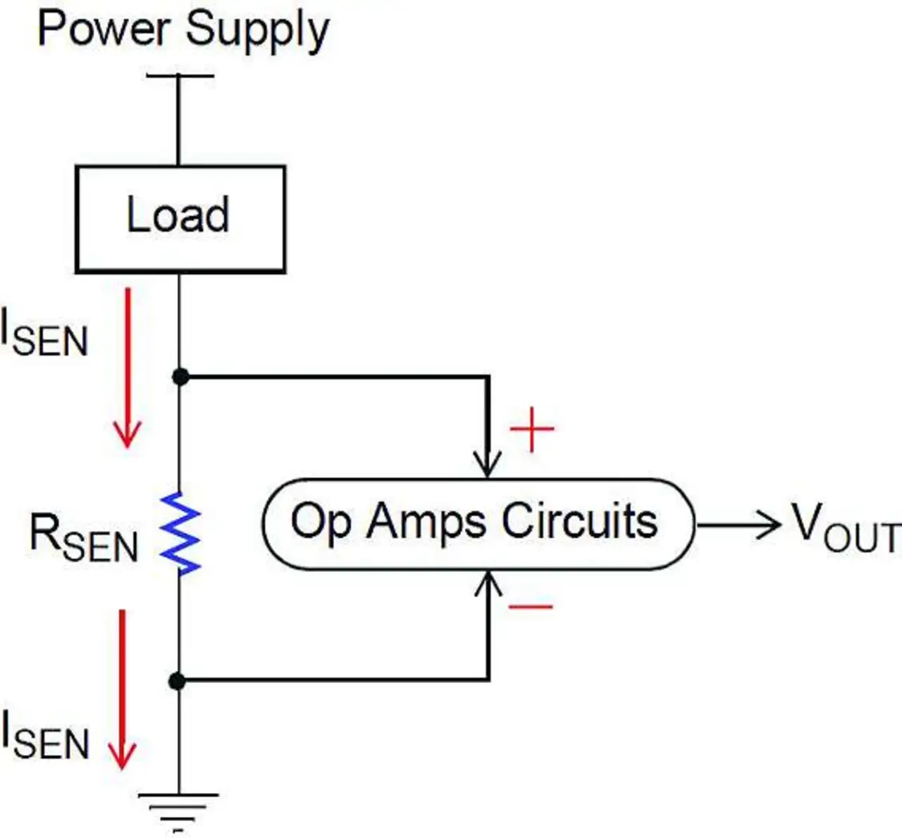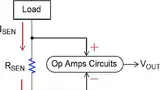Normalerweise ist das erfasste Spannungssignal (VSEN = ISEN· RSEN) so klein, dass man es über angeschlossene Operationsverstärkerschaltungen (z.B. einen nichtinvertierenden Verstärker) verstärken muss, um eine messbare Ausgangsspannung VOUT zu erzielen. Diese Konfiguration liefert eine geringe Eingangs-Gleichtaktspannung, sie besitzt asymmetrische Ein- und Ausgänge und ist einfach und kostengünstig. Allerdings reagiert diese Schaltung sehr empfindlich auf Störungen des Massepfads, und der Massepegel aus der Sicht der Last (Anwendungsschaltung) wird gegenüber der Systemmasse angehoben, da RSEN einen unerwünschten Widerstand in den Massepfad einführt.