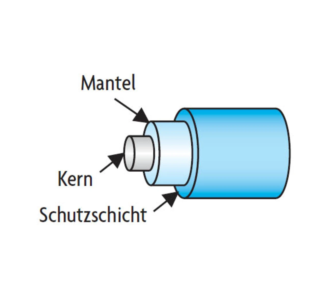 Eine Glasfaser setzt sich aus drei Hauptbestandteilen zusammen: einem Kern, einem Mantel und einer Schutzschicht (Bild 1). Der Mantel reflektiert Streulicht zurück in den Kern und gewährleistet so minimalen Verlust bei der Übertragung des Lichts durch den Kern. Dies wird durch einen höheren Brechungsindex im Kern gegenüber dem Mantel erreicht und führt zu einer vollständigen Reflexion des Lichts im Inneren des Kerns.