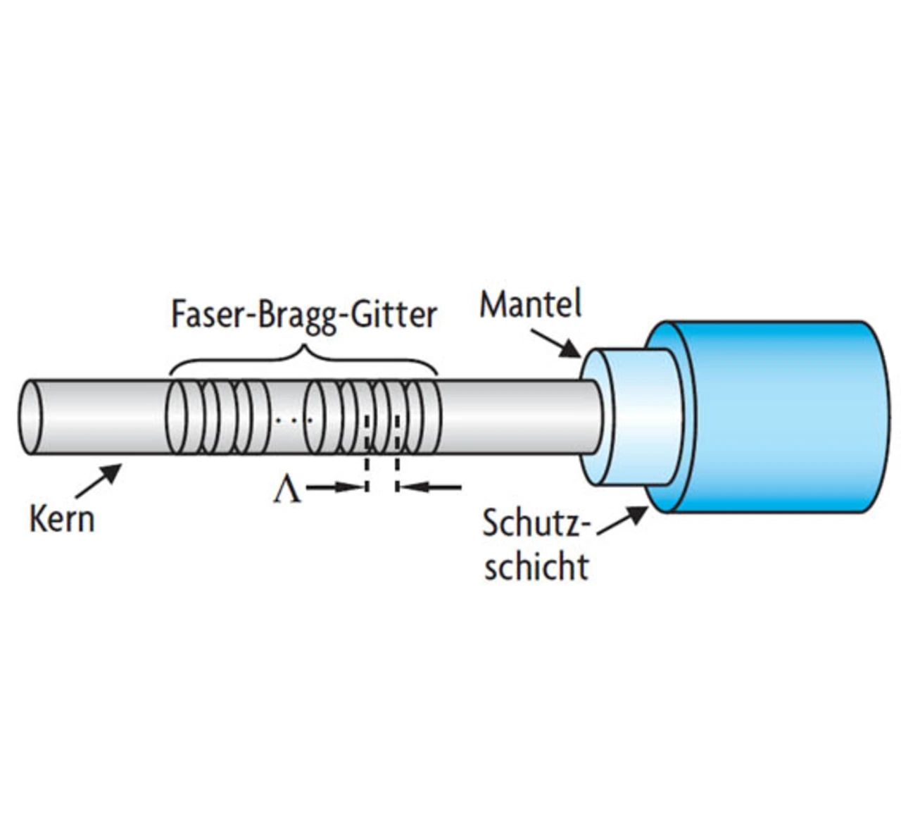 Einer der am häufigsten eingesetzten und weit verbreiteten optischen Sensoren ist der Sensor mit Faser-Bragg-Gitter (FBG), der eine Wellenlänge des Lichts reflektiert, die durch Temperatur- und/oder Dehnungsabweichungen verändert wird. FBGs werden hergestellt, indem ein kurzes Stück einer lichtempfindlichen Faser mithilfe holografischer Interferenz oder einer Phasenmaske periodisch verteilter Lichtintensität ausgesetzt wird. Der Brechungsindex der Faser wird dabei laufend entsprechend der Lichtintensität beeinflusst. Die dadurch entstehende periodische Abweichung des Brechungsindexes wird als Faser-Bragg-Gitter bezeichnet.