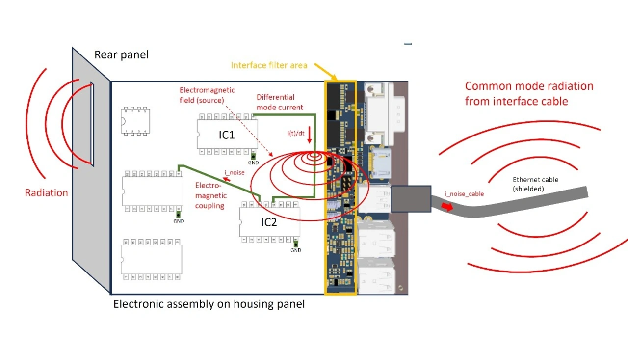 So wie oben beschrieben, „wandert“ die elektromagnetische Energie, d. h. die Störung, von der Quelle zu den Schnittstellen eines Gerätes und von dort über Öffnungen in Gehäusen und Kabelanschlüssen in die „Umwelt“.