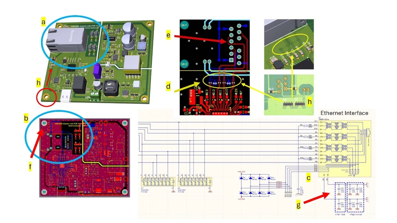 Die Baugruppe in Bild 2 ist ein GB-Ethernet-Front-End mit „Power Over Ethernet“. Der Ethernet-Anschluss (a) erfolgt über eine Buchse mit integriertem Interface (c), das Übertrager, Anpassungsnetzwerke und CM-Drosseln enthält. Dieses geschirmte Modul zusammen mit den Boardbefestigungen (h) sind die Basis für eine Massereferenz und einen niederimpedanten Anschluss zu einem Blechgehäuse. Zusätzlich kann für den Einbau in ein Kunststoffgehäuse das Gehäusemasse/PCB-Massesystem über Bestückungsplätze (g, h) individuell gestaltet werden. Die vier Ethernet-Kanäle sind als symmetrische Leiterpaare geführt (e), in die die TVS-Dioden (d) unmittelbar in den Signalpfad eingeschleift sind. Alle symmetrischen Leitungspaare sind hinsichtlich Zeitversatz (Skew) in ihrer Länge und hinsichtlich Systemimpedanz (100 W symmetrisch) abgeglichen. Eine impedanzkorrigierte Schirmung der Leitungspaare links- und rechtsseitig mit einer Massefläche verringert parasitäre Kopplungen (h).