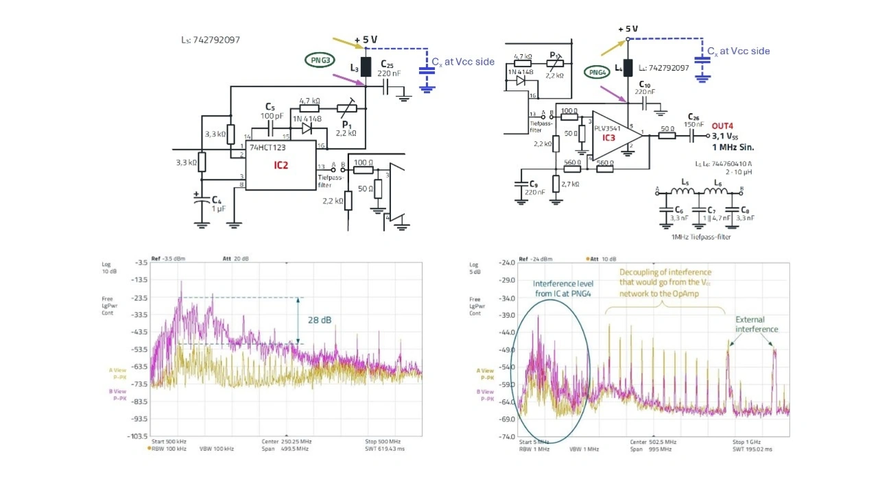 Entkopplungskondensatoren und Filter zur IC-Stromversorgung werden unmittelbar in der Nähe von Stromversorgungsanschlüssen der ICs platziert, um hochfrequente Störungen abzublocken. Sie helfen nicht nur dabei, Spannungsschwankungen zu reduzieren und eine stabile Stromversorgung sicherzustellen, sondern blocken die vom IC ausgehenden Störungen ab. Dabei ist die Auswahl der passenden Filterbauteile essenziell [2]. Bild 3 verdeutlicht die Situation.