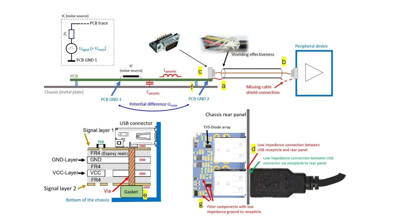 Nur ein beidseitig an Masse angeschlossener Kabelschirm (a, b) schirmt auch gegen magnetische Felder. Hierzu ist es notwendig, dass der Steckverbinder (c) rundum kontaktierend und niederimpedant am Gehäuse kontaktiert (d). Zusätzliche niederimpedante galvanische Verbindungen können über Kontaktierungen der Baugruppe im Filterbereich realisiert werden (e, f). Dadurch werden sowohl die Schirmeigenschaften der Peripheriekabel deutlich besser, des Weiteren bekommen TVS-Dioden, SMD-Varistoren und Kondensatoren von Filtern einen „besseren“ Massebezug (g). Eine niederimpedante Verbindung der GND-Bezugslage (f) reduziert die CM-Störungen auf der GND-Bezugsmasse und verbessert die Signalintegrität der gesamten Schaltung.