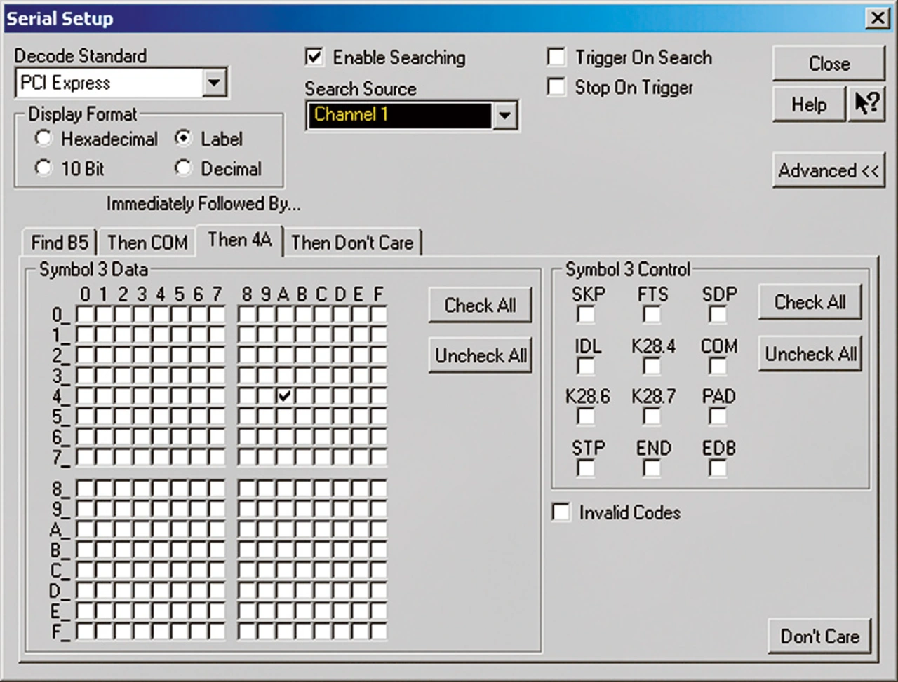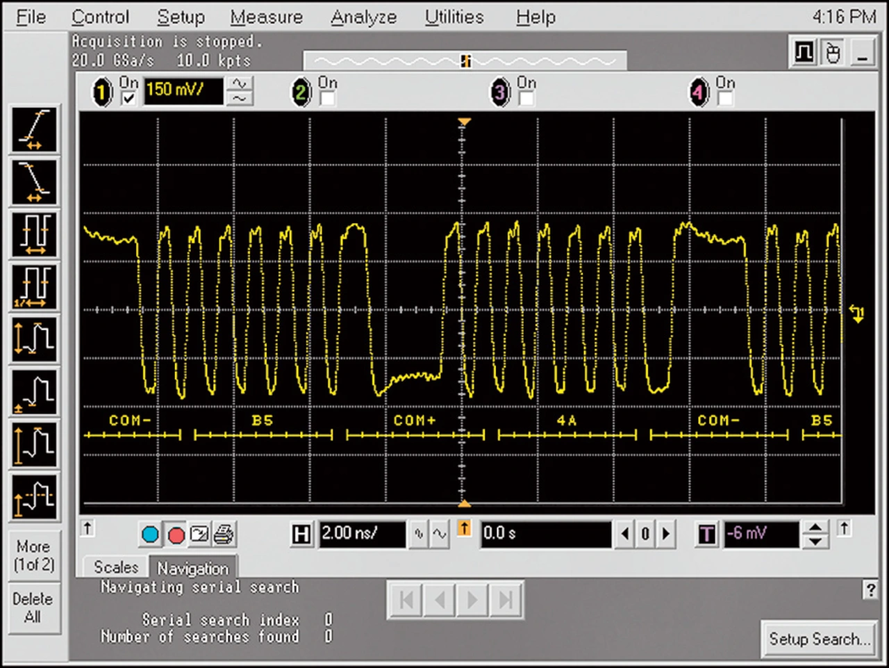 Nach erfolgter Taktrückgewinnung kann das erfasste Signal decodiert werden; dabei wird die ursprüngliche Folge von Einsen und Nullen rekonstruiert. Der decodierte serielle Datenstrom kann auf bestimmte Muster durchsucht werden, um beispielsweise festzustellen, welche Ereignisse einem Fehler vorangegangen sind. Einen langen Datenstrom aus Zehntausenden von Einheitsintervallen zu durchsuchen, kann allerdings eine abschrecken-de Aufgabe sein. Glücklicherweise gibt es (sowohl hardware- als auch softwarebasierte) Werkzeuge, die diese Aufgabe erleichtern.