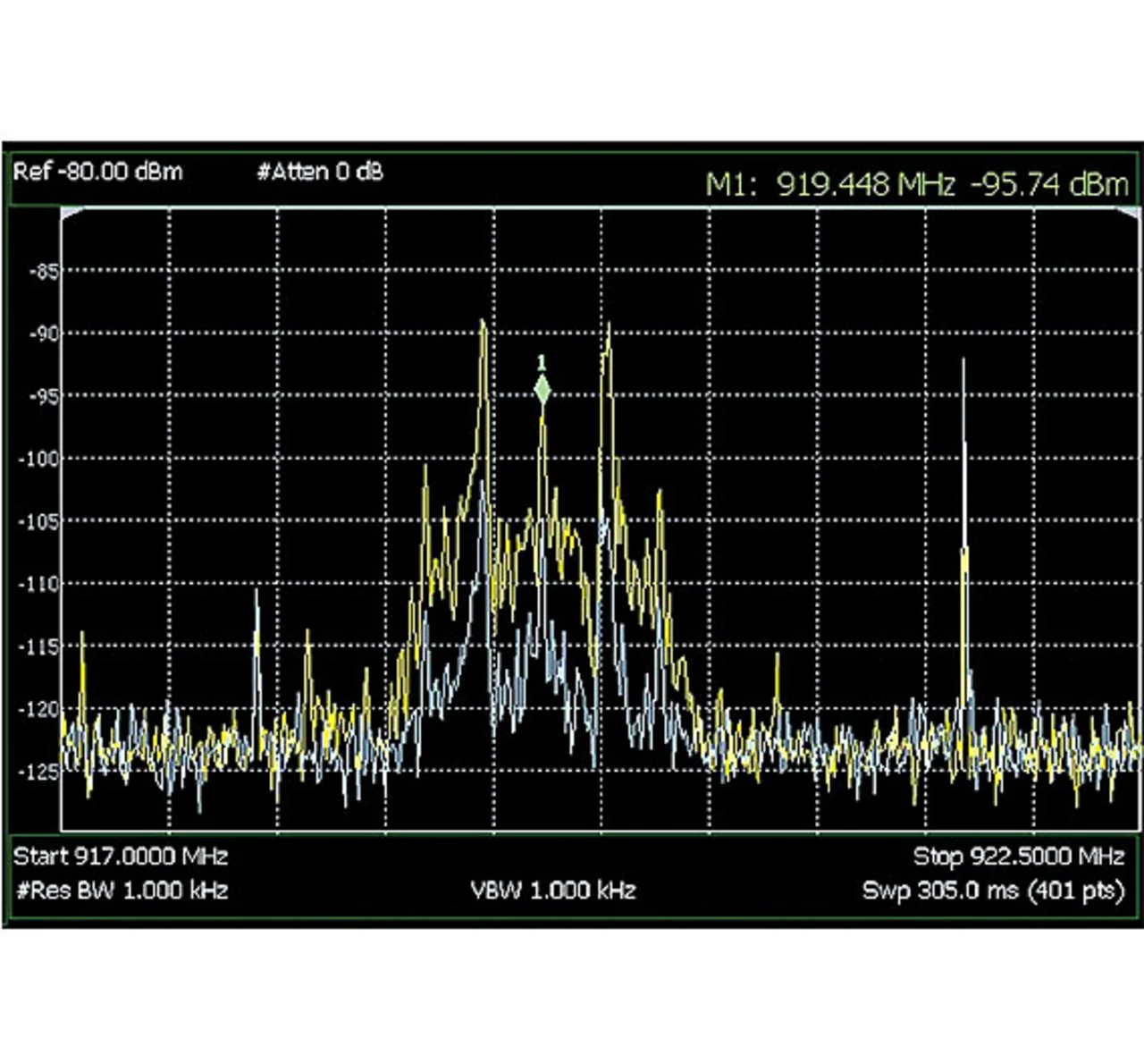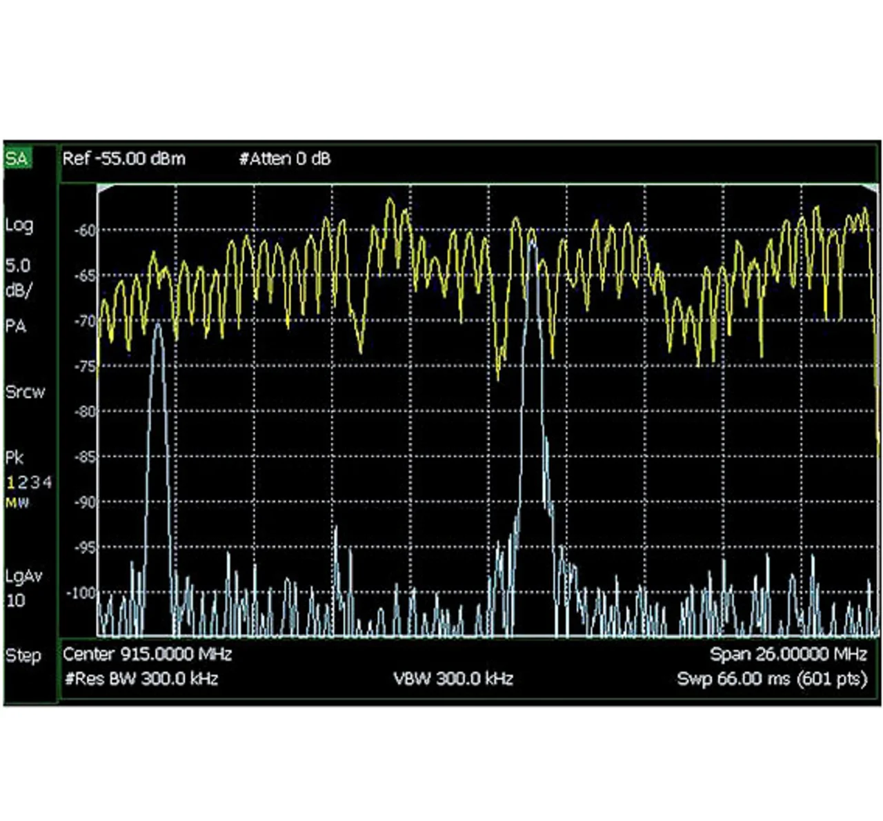 So kann z. B. im Max-Hold-Modus der Spektrumanalysator den jeweils maximalen Wert von unterschiedlichen Mess- durchläufen (Sweeps) speichern und darstellen (Bild 2).