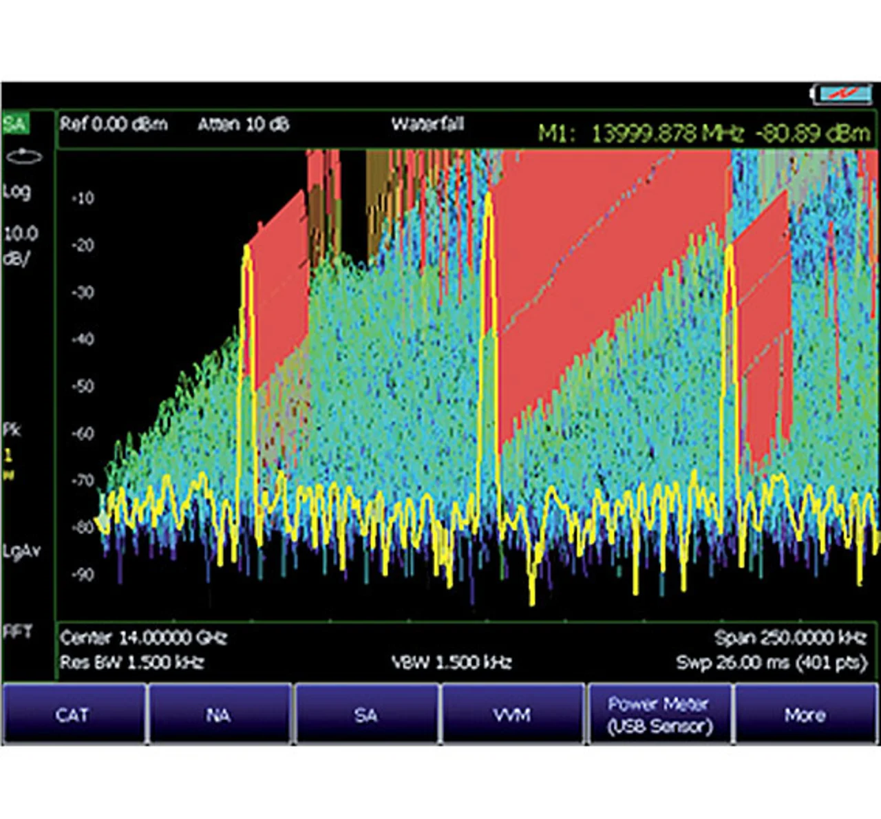 Ein Spektrogramm ist eine einzigartige Möglichkeit, ein frequenz-, zeit- und amplituden-abhängiges Signal auf einem Display darzustellen. Es zeigt die Abfolge des Frequenzspektrums als eine Funktion der Zeit, wobei eine farbliche Zuordnung die Amplitude des Signals darstellt. Ein Wasserfall-Diagramm bietet eine farbcodierte 3D-Darstellung der Amplitudenpegel als Funktion der Frequenz und Zeit (Bild 3).