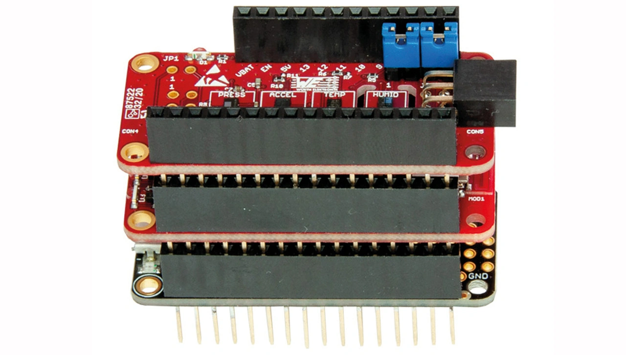 Zur Verifizierung der relativ simplen LTspice-Simulation, wurden zusätzlich Messungen an einem SensorBLE-FeatherWing-Kit von Würth Elektronik (Bild 5) durchgeführt. Dieses Kit besteht aus einer Masterplatine mit Mikrocontroller. Die anderen beiden Platinen umfassen ein WE-Bluetooth-Modul sowie verschiedene WE-Sensoren (3-Achsen-Beschleunigung, Temperatur, Feuchtigkeit, Druck).