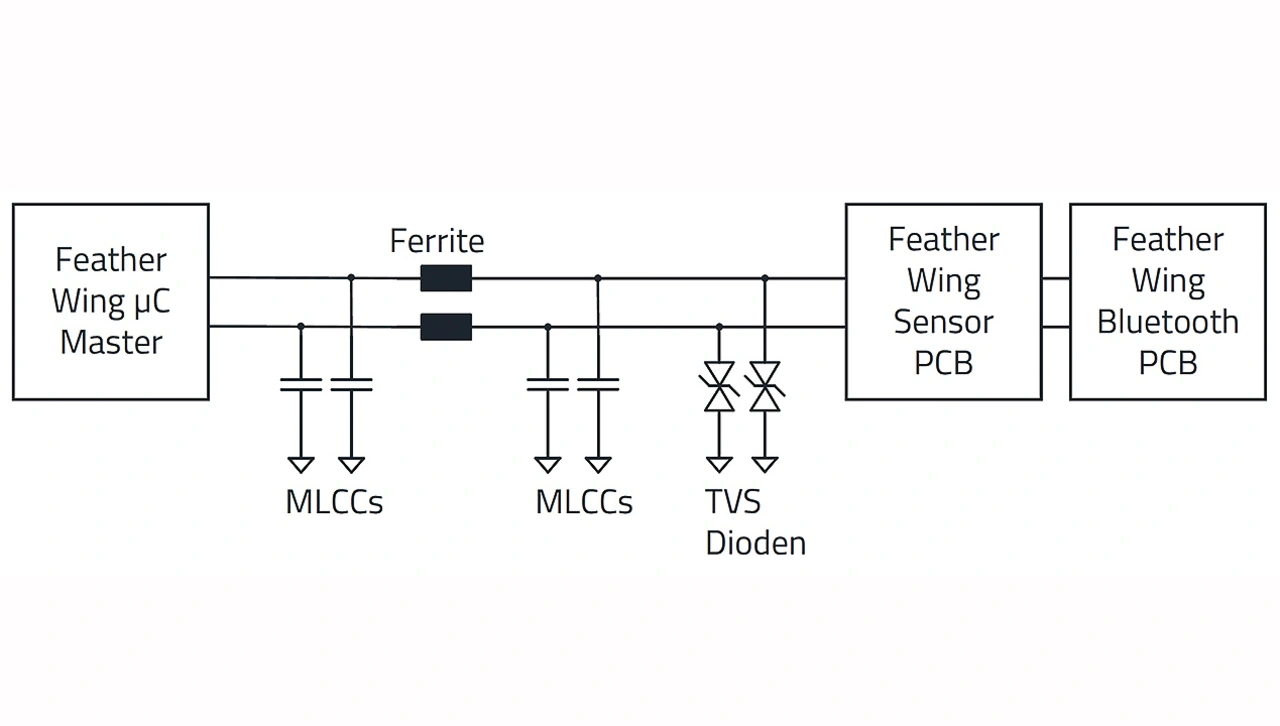 Die Masterplatine kommuniziert mit den anderen beiden via I²C-Bus bei einer maximalen Datenrate von 400 kBit/s (Bild 6). Mit einer geeigneten Smartphone-App (z. B. WE-SensorBLE) lassen sich die Sensordaten dann visualisieren. Zur Nachbildung einer parasitären Kapazität von 400 pF gegenüber GND kommen MLCCs zum Einsatz. Es wurde zudem der in der Simulation modellierte Multilayer-SMT-Ferrit (742792693) verbaut, plus ein TVS-Diodenarray (824012823). Kabellitzen mit einer Länge von 20 cm verbinden die Sensorplatine mit dem restlichen I²C-Bus. Eine derartige Anordnung lässt sich in vielen Applikationen in der Praxis beobachten.