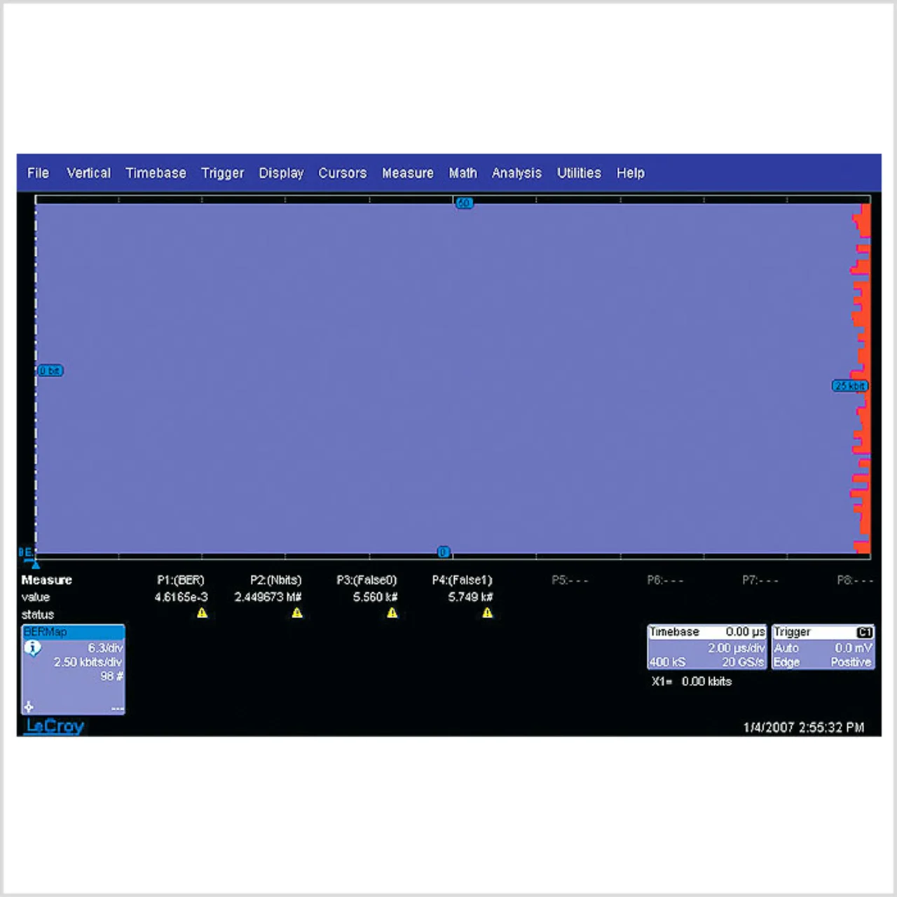Die Messung des BER (Bitfehler-Verhältnis – Anzahl der falsch empfangenen Bits/Anzahl der richtigen Bits) wird über die Oszilloskop-Funktion durchgeführt, welche das empfangene Pattern mit dem vorgegebenen Muster vergleicht (Bild 9). P1 gibt in Bild 9 das BER an, P2 die Anzahl der beteiligten Bits, P3 die Anzahl der „falschen 0“ und P4 die Anzahl der „falschen 1“.