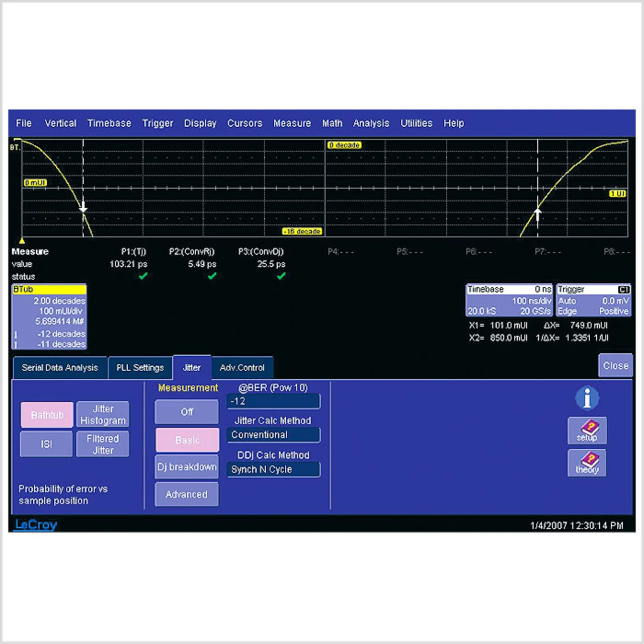 „Dj breakdown“ setzt sich aus drei Werten zusammen: Periodic jitter: periodische Signale modulieren die Flankenposition; Duty cycle jitter: Änderungen des Tastverhältnisses; Data dependant jitter: durch Dateninhalt hervorgerufene Veränderungen. Der Wert von P1 wird errechnet und entspricht dem Spitze-Spitze-Wert des Jitters für ein BER von 10–12 und setzt sich aus dem Random Jitter (mittlere Abweichung, Gaußscher Anteil) und dem Deterministischen Jitter zusammen.
