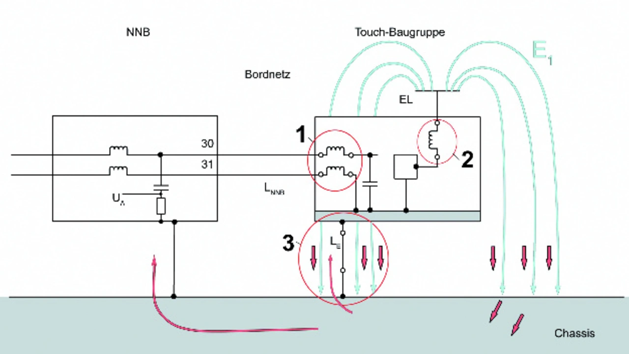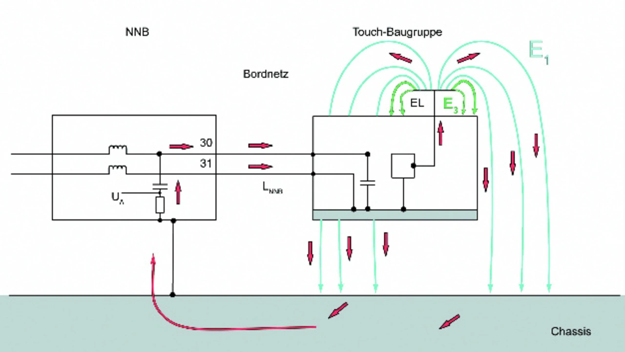 Bild 3 zeigt den Wirkzusammenhang zur Störaussendung. Von der Elektrode EL geht bei Speisung mit HF-Spannung ein elektrisches Feld aus. Das Feld ist in zwei Bereiche unterteilbar. Das Feld, das von der Elektrode E3 zur Masse der Touch-Baugruppe führt, ist der Kapazität C3 zugeordnet. Es verringert den Wirkungsgrad des Touchs. Das Feld E1, das von der Elektrode EL zum Finger oder zur Umgebung (Chassis) geht, ist der Kapazität C1 zugeordnet. Es steuert den Touch. Entlang der Feldlinien E1 fließt ein Verschiebestrom. Der Verschiebestrom fließt praktisch durch die Kapazität C1. Dieser Strom gelangt von der Elektrode EL auf das Chassis und fließt bei der EMV-Prüfung zur Bordnetznachbildung, von dort über die Bordnetzversorgung zur Touch-Baugruppe zurück. Dies ist der Strom, der die Störaussendung der Touch-Baugruppe verursacht. Er erzeugt in der Bordnetznachbildung an einem Messwiderstand die Ausgangsspannung UA der Bordnetznachbildung.