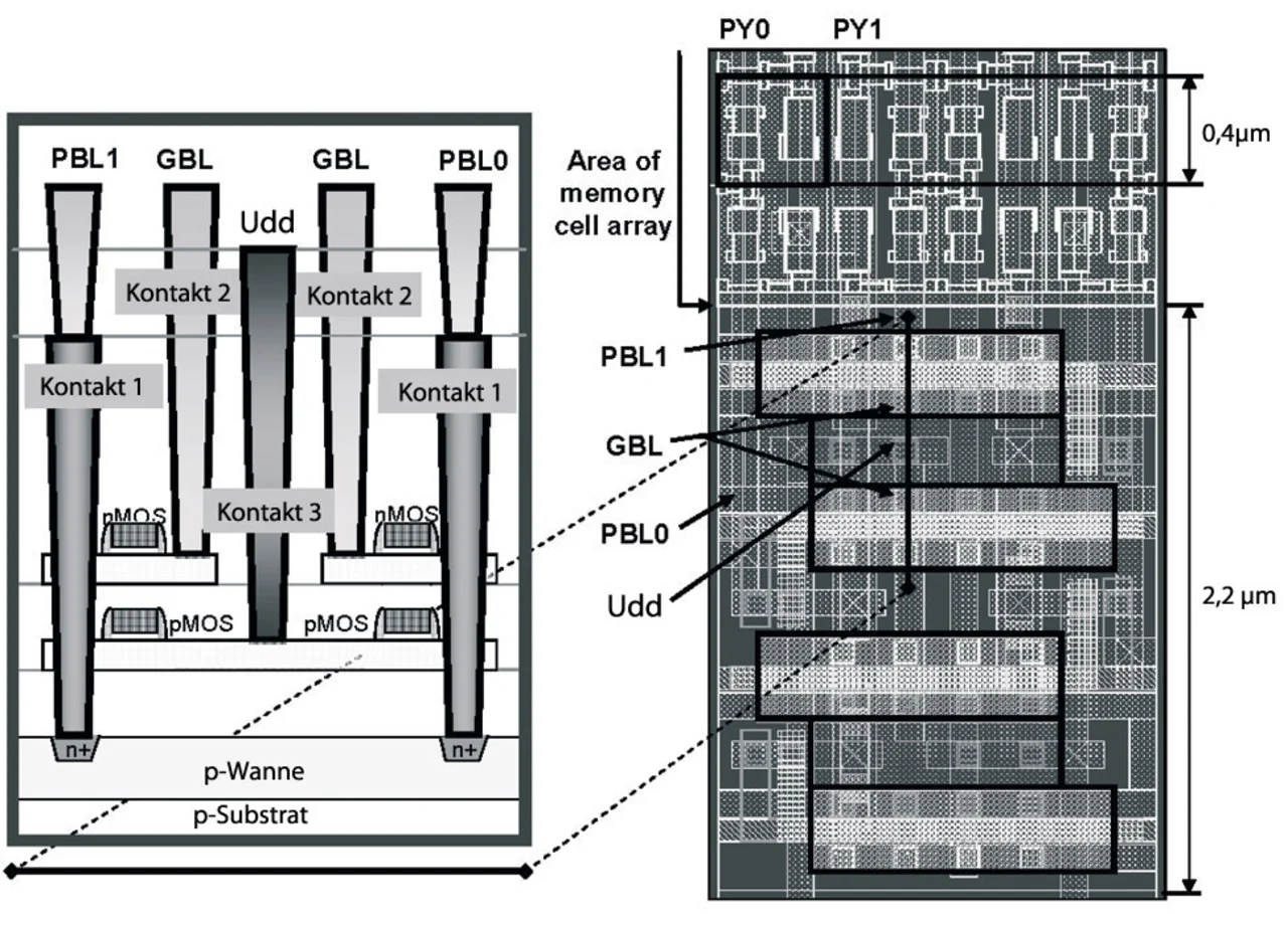 Dynamische Speicher haben in jüngster Zeit bedeutende Fortschritte im Einsatz in Applikationen gemacht, die hohe Übertragungsbandbreiten erfordern. Neben konventionellen DRAMs lassen sich auch Entwicklungsansätze in Richtung von Silicon-on-Insulator- (SOI) und Dual-Ported-DRAMs sowie in Richtung besonders schneller und besonders sparsamer DRAMs beobachten. Mit weiter schrumpfenden Strukturen spielen auch die Prozessabweichungen eine immer größere Rolle. Aufwendige statistische Analysen korrelierter Prozessparameter ermöglichen eine genauere Modellierung der „Worst-case“-Bedingungen in der Variation der Bauelemente-Parameter.