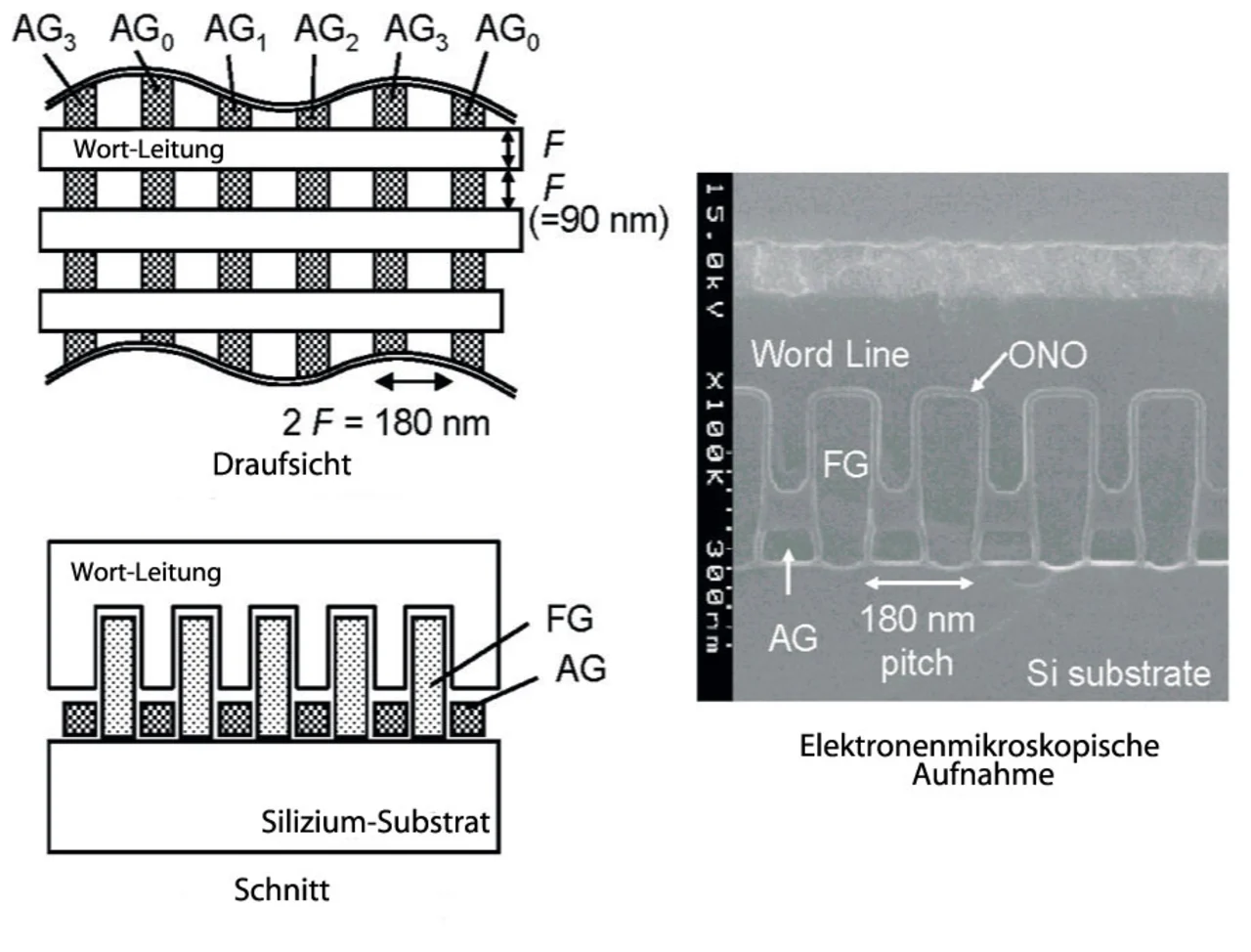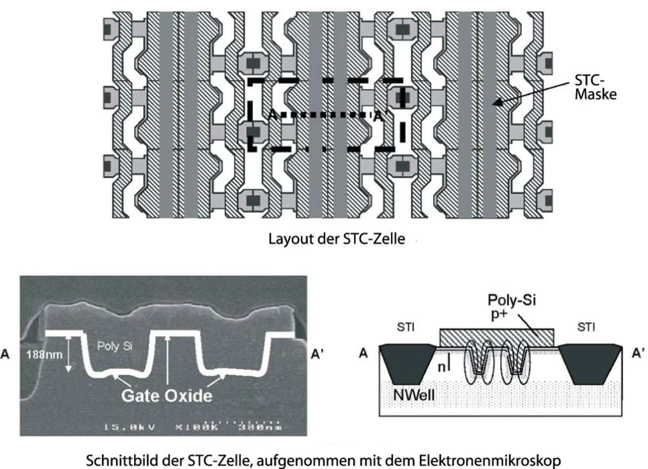 Zufallszugriffe bei einer Taktfrequenz von 300 MHz sind heute bei Embedded DRAMs Stand der Technik. Dass die präzise Abstimmung von Schaltungen die Erfassungsmargen erheblich erhöhen kann, zeigte ein 322-MHz-Embedded-DRAM von Matsushita. Der in einem 90-nm-Logikprozess realisierte Baustein ist durch eine rauscharme Architektur und eine hochgenaue Abstimmung nach der Fertigung gekennzeichnet. Mit einer Kapazität der Zelle von 5 fF, einer Verbesserung von 61 % bezüglich der Erfassungsgenauigkeit (sensing accuracy), lässt sich der Chip mit 322 MHz betreiben und benötigt nur eine Leistung von 60 µW für die Datenauffrischung. Gleichzeitig hat Matsushita noch ein 400-MHz-Dual-Port-Interleaved-DRAM mit „Striped Trench“-Kondensator-Zelle (Bild 7) und einer Kapazität von 10 fF vorgestellt, das in einem 0,15-µm-Prozess realisiert wurde. Zu den Spezialitäten gehören bei diesem Chip eine „sense-signal-loss“-Kompensation, die auf dem genauen Rauschverhalten basiert, sowie eine „write-before-sensing“-Schaltung.