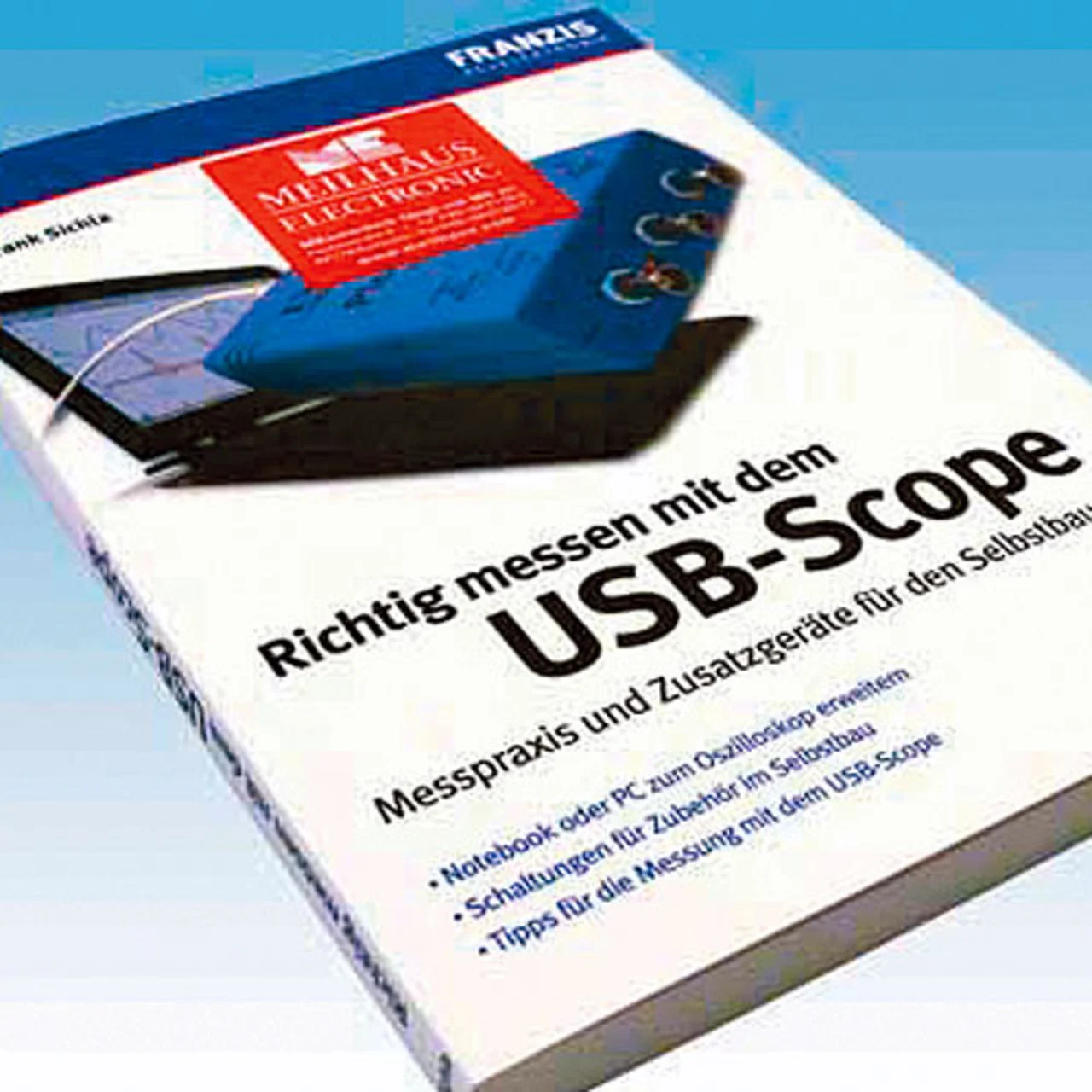 Ein die USB-Boxen fundiert erläuterndes Buch ist unter der ISBN 978-3-7723-4307-0 im Franzis-Verlag erschienen und kostet 19,75 Euro. Es nennt sich „Richtig Messen mit dem USB-Scope“, der Autor ist Frank Sichla. Das Buch beschreibt, wie USBScopes ein Notebook oder den PC zum leistungsfähigen Oszilloskop, dem Allround-Messgerät in der Elektronik, erweitern. Der Autor vermittelt in diesem Buch nicht nur praktisches Rundumwissen zu den USB-Scopes, zu Grundtypen, Technik und Anwendungsmöglichkeiten sowie -grenzen, sondern liefert auch praktische Bauanleitungen und interessante Schaltungen für sinnvolles Zubehör. Damit kann man das Scope beträchtlich aufwerten. Die Vorstellung einiger USB-Scopes anhand wichtiger Daten und Testergebnisse rundet das Thema ab. Dabei wird deutlich, wie vielseitig USB-Scopes sein können. Einige Kapitel: