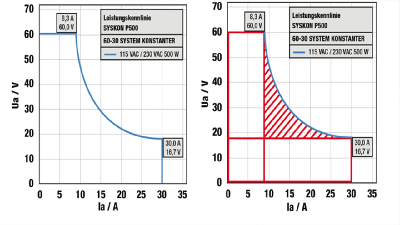 Ein weiterer Vorteil einer guten Laborstromversorgung ist die sogenannte Weitbereichskennlinie (Autoranging), die neben einer maximal einstellbaren Spannung einen maximal einstellbaren Strom zulässt, der aufgrund der ausgewiesenen Nennleistung des Gerätes eigentlich nicht möglich wäre. Auf diese Weise sind sehr viel mehr Kombinationen von Strom und Spannung am Leistungsausgang möglich, als dies bei Geräten mit Rechteckkennlinien der Fall wäre (Bild 2). Möchte man zum Beispiel zwei verschiedene Lasertypen testen – einer arbeitet mit einer Spannung von 25 V bei Strömen bis 180 A, der andere mit 60 V bei Strömen bis 75 A –, lässt sich dies bereits mit einer Stromversorgung mit einer Nennleistung von 4,5 kW erreichen (25 V x 180 A bzw. 60 V x 75 A), wenn diese eine Weitbereichskennlinie aufweist. Geräte mit Rechteckkennlinie müssen entweder von der Leistung her größer dimensioniert sein (60 V x 180 A = 11 kW), oder man braucht schlicht zwei oder im ungünstigen Fall sogar drei Geräte. Ein Autorange-Gerät ist somit die ökonomischere Alternative.
