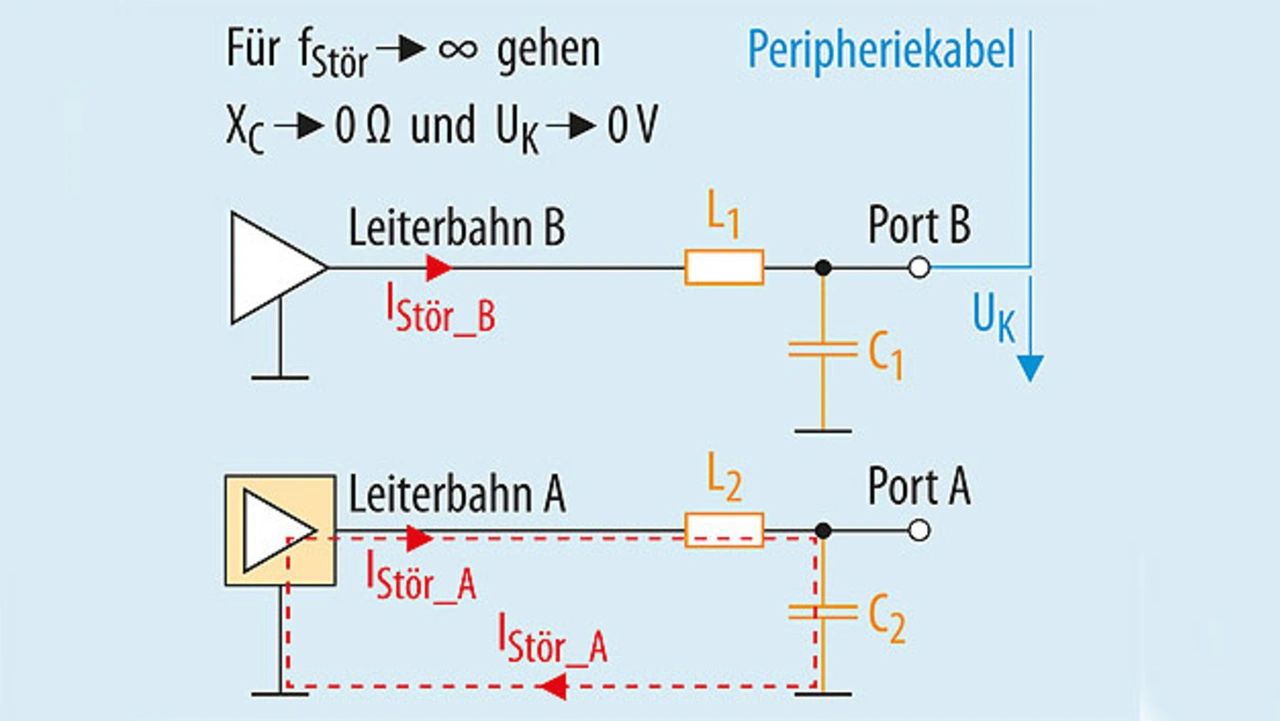 In Bild 7 ist für jeden Stromkreis ein vollständiger Tiefpass vorgesehen. Im Quellstromkreis mit der Leiterbahn A wird mit zunehmender Ströfrequenz der Störstrom IStör_A abnehmen, durch die steigende Impedanz der Drossel L2 wird der Störspannungsabfall über der Drossel zunehmen. Damit die Störsspannung am Port A gering ist, schließt der Filterkondensator C2 mit seiner geringen Impedanz bei hoher Frequenz den Port kurz – der frequenzabhängige Spannungsteiler wirkt.