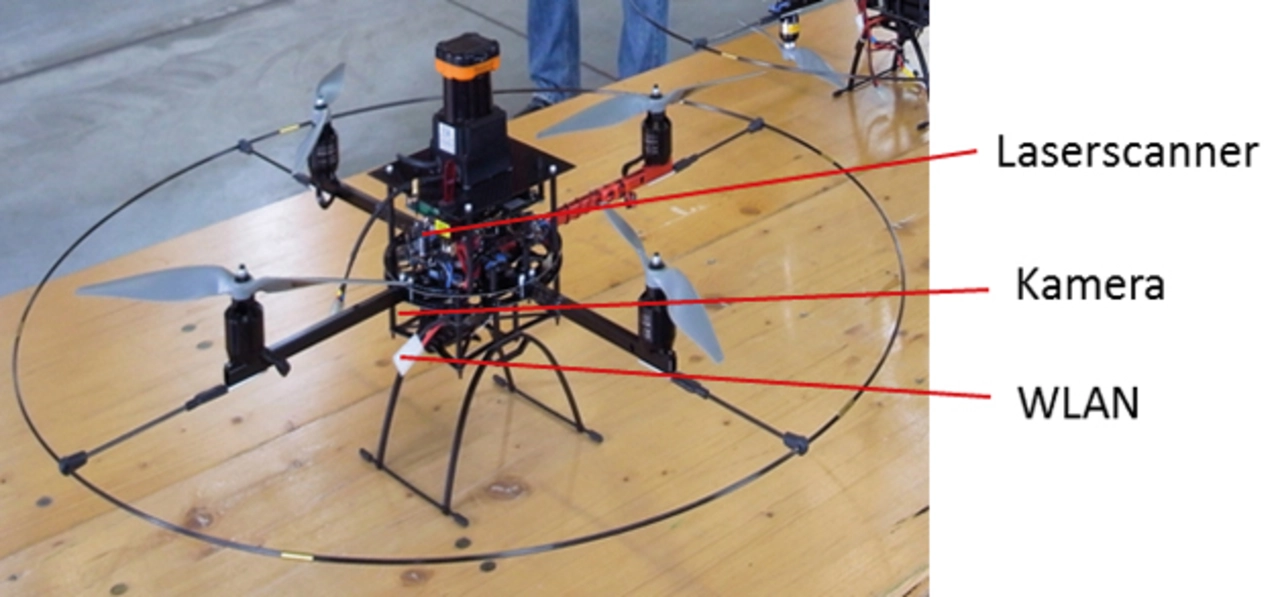 Zur Unterstützung setzt man zunehmend Roboter ein, ausgestattet mit Kameras, Laser-Scannern, Radar, Mikrofonen und verschiedenste Sensoren (Bild 2). Sie können sich dichter an das Geschehen heranwagen als Menschen und aufschlussreiche Informationen beschaffen. Mit Rädern oder Raupen können sie aber nicht über beliebige Schuttberge klettern, in verschüttete Räume eindringen oder tiefes Wasser durchqueren. Ergänzende Informationen liefern Drohnen mit Kameras (Bild 3), aber auch diese gelangen nur selten in das Innere von Gebäuden. Man braucht noch weitere Methoden, um zu wichtigen Kenntnissen zu kommen, insbesondere über Bereiche, die für Menschen oder Maschinen nicht erreichbar sind. Außerdem sind schnellstmöglich Karten oder Baupläne aufzunehmen, weil die vorhandenen oft unzureichend oder nicht zugänglich sind.