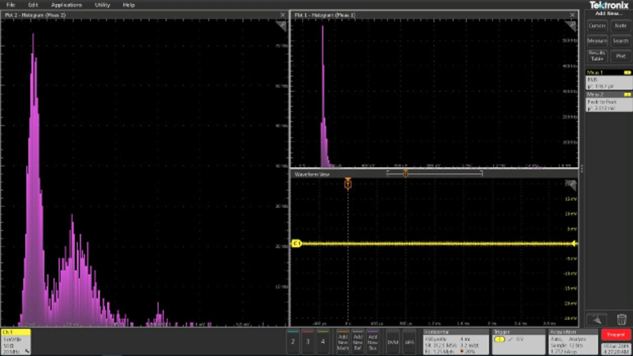Es ist fragwürdig, ob sich der geringe Netzgerätelärm über die Bananenbuchsen auch auf das Steckbrett bringen lässt. Deshalb wird mit der profanen Verbindetechnik nachgemessen: der passive 10-MOhm-Tastkopf an 4-mm-Messerleisten und ein 50-Ohm-Koaxialkabel mit BNC- auf Bananenstecker. Die Messung erfolgt in der angeschalteten Quelle, bei Quellparameter UQ = 0 V . Für jede Verbindung und Eingangsbereich wurde einige Minuten ein Histogramm von VRMS und VPP aufgenommen (Bild 10). Die Spannungsbasis wird derart gewählt, dass gerade kein Clipping mehr stattfindet.