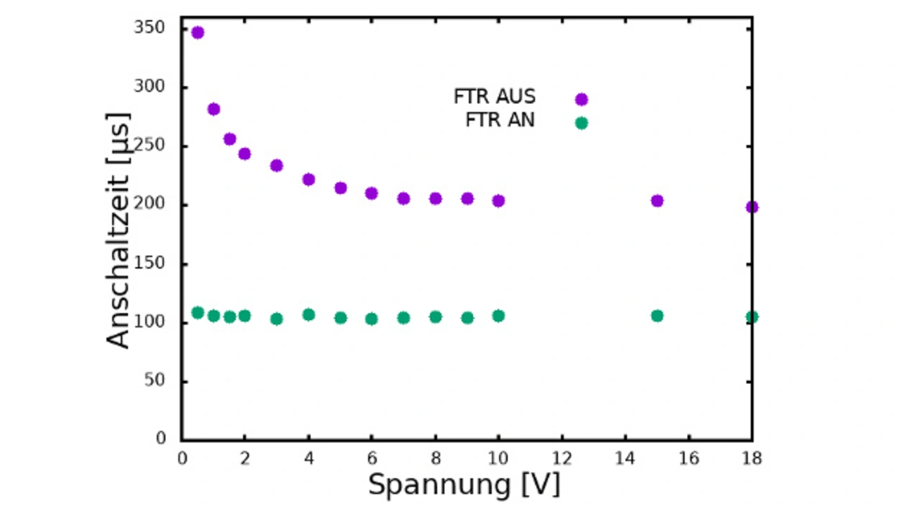 Die Timingmessung benötigt keine besondere Empfindlichkeit und erfolgt mit dem passiven Tastkopf an den Messerleisten (bei 10-MΩ-Kopplung). Dann wird die Anschaltzeit in Abhängigkeit von FTR und Normalmodus im Spannungsbereich von 0 V bis 20 V evaluiert cdn.weka-fachmedien.de/media_uploads/documents/1547652197-303-setrudisngl.zip" href="https://github.com/drconcon/LabCode/blob/master/trvstftr.py">[7]. Im FTR-Modus beträgt diese konstant etwa 100 µs, im Normalmodus steigt sie hin zu kleineren Spannungswerten an (Bild 11).