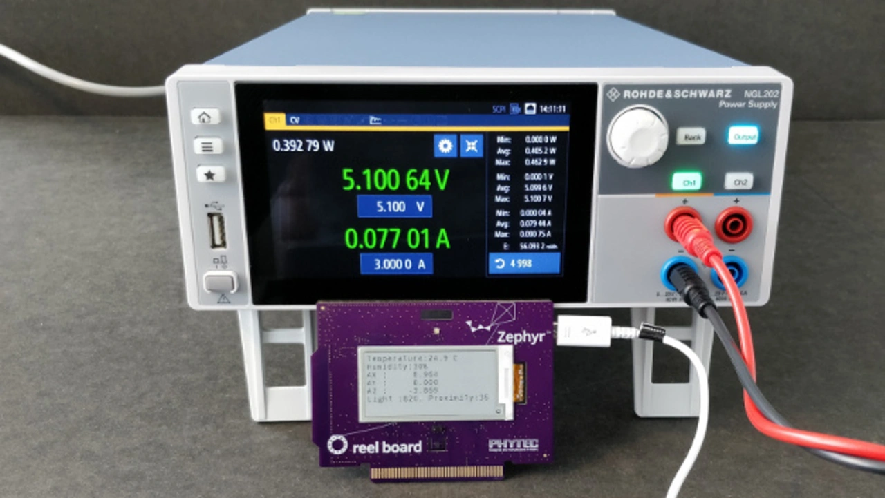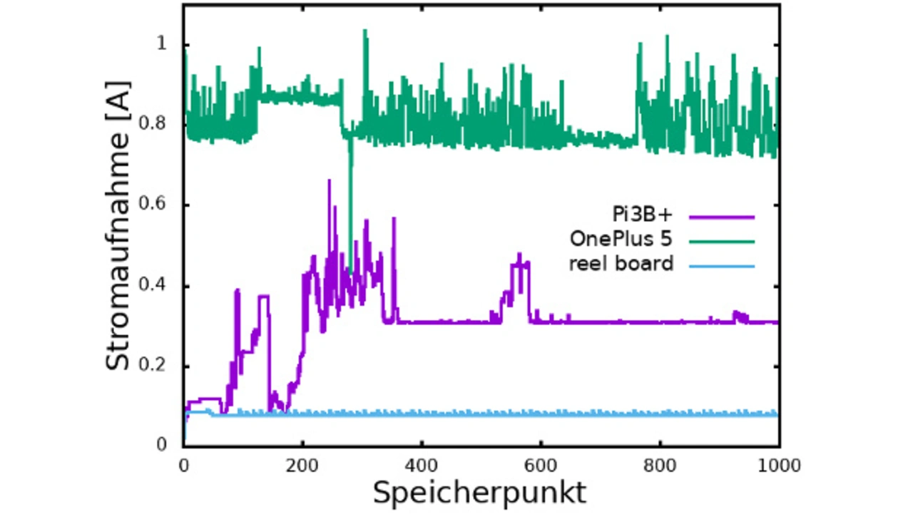 Mit einem Bananen-auf-USB-Stecker können bidirektional, Strom-Spannungs-Charakeristika von allerhand Embedded-Geräten, aufgezeichnet werden. Das Beispiel betrachtet die Stromaufnahme eines Raspberry-Pi3B+ während des Bootens, das Ladeverhalten von OnePlus-5 und dem reel_board unter Akquise und Anzeige (Bild 12, Bild 13). In einem realistischen Anwendungsfall startet ein Embedded-Entwickler den Datenlogger und initialisiert sein Device in einen Low-Power-Zustand, aus einem einzigen Pythonskript heraus.