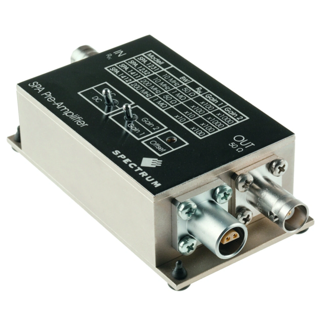 Für Pulse mit niedrigen Amplituden, die möglicherweise vor der Einspeisung in den Digitizer vorverstärkt werden müssen, bietet Spectrum ebenfalls eine Reihe an kleinen und kompakten Vorverstärkern (Bild 3), die mit den oben genannten Digitizern kombiniert werden können. Diese rauscharmen Vorverstärker sind mit AC- und DC-Kopplung, 50 Ω bis 1 MΩ Impedanz, 10- bis 100-facher Verstärkung und Bandbreiten von bis zu 2 GHz verfügbar.