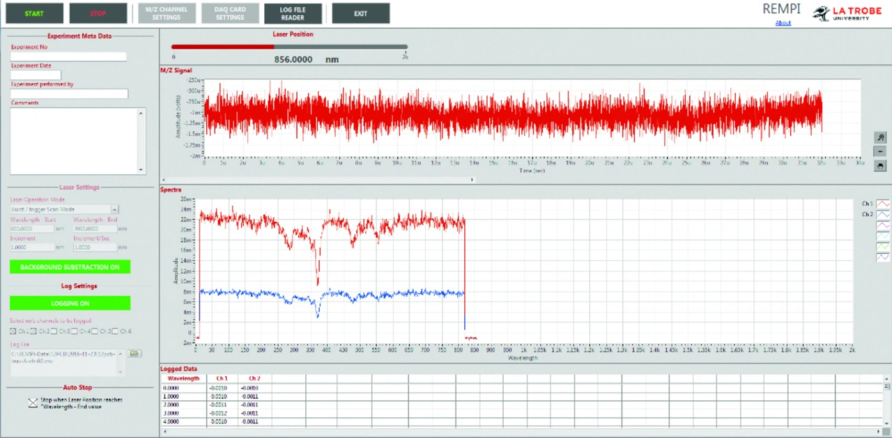 Die Technik basiert auf einem Time-of-Flight-Massenspektrometer, bei dem bestimmte Ionen auf Grundlage ihrer Ankunftszeit ausgewählt werden. Ein an der Latrobe University in Melbourne (Australien) entwickeltes Instrument verwendet einen PCIe-Digitizer von Spectrum (Modell M3i.4121-exp) mit 250 MSa/s und 14 bit für Datenaufzeichnung, -anzeige und -analyse. Bild 4 zeigt Screenshots des Einrichtungsfensters des Systems und die Ergebnisse beim Erfassen von Spektren. Die Digitizer-Steuerung und Datenanalyse erfolgt mit einem individuell angepassten Programm, das mit LabVIEW entwickelt wurde.