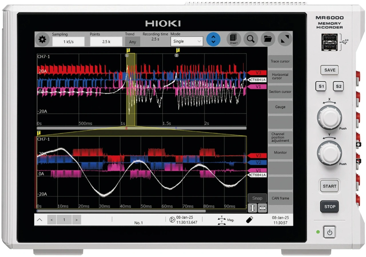 Zusätzlich zur Envelope-Funktion bietet der Speicherrekorder MR6000 von Hioki die neue Dual-Sampling-Funktion. Sie eignet sich für Anwendungen, die sowohl eine detailreiche Abtastung bei hoher Geschwindigkeit als auch eine Langzeitüberwachung von Trenddaten erfordern. Bei Einsatz der Dual-Sampling-Funktion werden Daten gleichzeitig mit zwei unterschiedlichen Geschwindigkeiten aufgezeichnet. Beim High-Speed-Sampling werden Transienten und andere ungewöhnliche Phänomene bis ins kleinste Detail erfasst, während beim Low-Speed-Sampling Trenddaten kontinuierlich über einen längeren Zeitraum überwacht werden. Mithilfe nutzerdefinierter Trigger konzentriert sich das Gerät beim High-Speed-Sampling selektiv auf bestimmte relevante Zeiträume und stellt so eine effiziente Nutzung des Speicherplatzes bei gleichzeitig detailreicher Datenerfassung sicher. Die Dual-Sampling-Funktion vereint die detaillierte Ereignisanalyse mit einer unterbrechungsfreien Datenüberwachung. Nutzer haben somit die Gewissheit, dass alle wichtigen Daten zuverlässig aufgezeichnet werden. Die Abtastraten, Trigger und Speichereinstellungen der Dual-Sampling-Funktion lassen sich je nach Anwendung individuell anpassen.