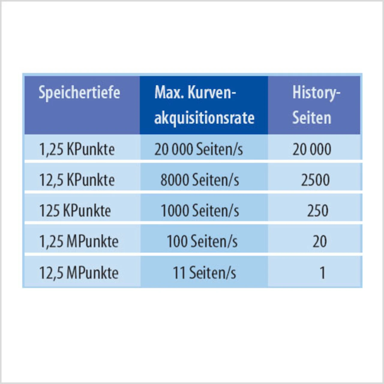 Durch Wiederholung dieser Abläufe lassen sich Kurvenakquisitionsdaten von bis zu 20 000 Seiten/s zusammen mit der Intensitätsabstufung erreichen (Beispiel in Bild 7). Die Tabelle gibt hierzu den Zusammenhang zwischen der Speichertiefe und der maximalen Kurvenakquisitionsrate wieder. Lesebeispiel: Bei einer Speicherlänge von 1,25 KPunkten werden 20 000 Seiten mit Daten als History-Daten gleichzeitig mit der Kurvenerkennung akkumuliert – ein sehr wichtiger Punkt deswegen, weil die Datenanalyse danach ausgeführt werden kann.