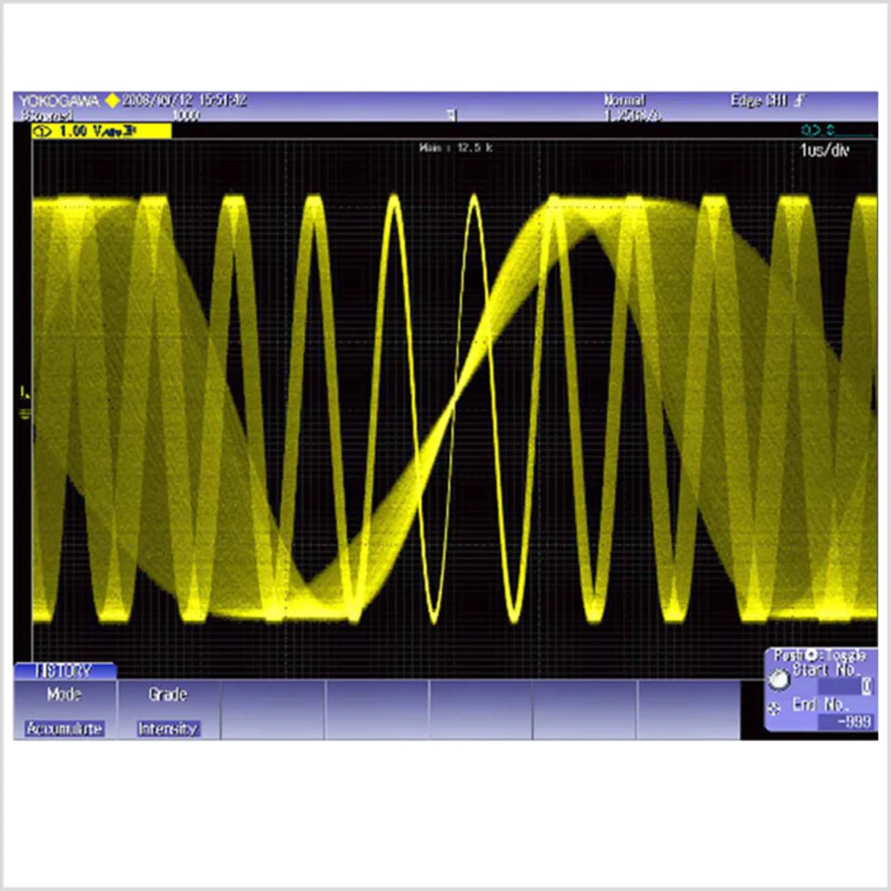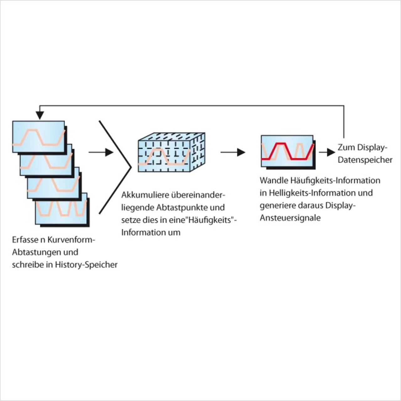 Dies wird bei der neuen Scope-Reihe mit der History-Speicherfunktion erreicht. Der History-Speicher ist eine spezifische Eigenschaft der Yokogawa-Oszilloskope, was einen Pluspunkt im Oszilloskop-Markt bedeutet, da auch die rückwirkende Analyse früherer Kurvenerfassungen möglich ist. Zur Funktionsweise: Der ScopeCORE-Prozessor erfasst die Kurven nicht synchron zum Anzeigezyklus (60 Hz), die Daten werden vielmehr „n-mal“ asynchron zum Anzeigezyklus im History-Speicher im primären Datenverarbeitungsbereich abgelegt. Bei der Generierung der Bildschirmdaten werden jedes Pixel der History-Daten verwendet und überlappende Abtastpunkte akkumuliert. Diese aufsummierte „Häufigkeitsinformation“ wird in Intensitätswerte umgewandelt und zum Anzeigespeicher geschickt (Bild 6). Die nachfolgende Datenakquisition wird gleichzeitig mit der Übermittlung der Bildschirmdaten ausgeführt.