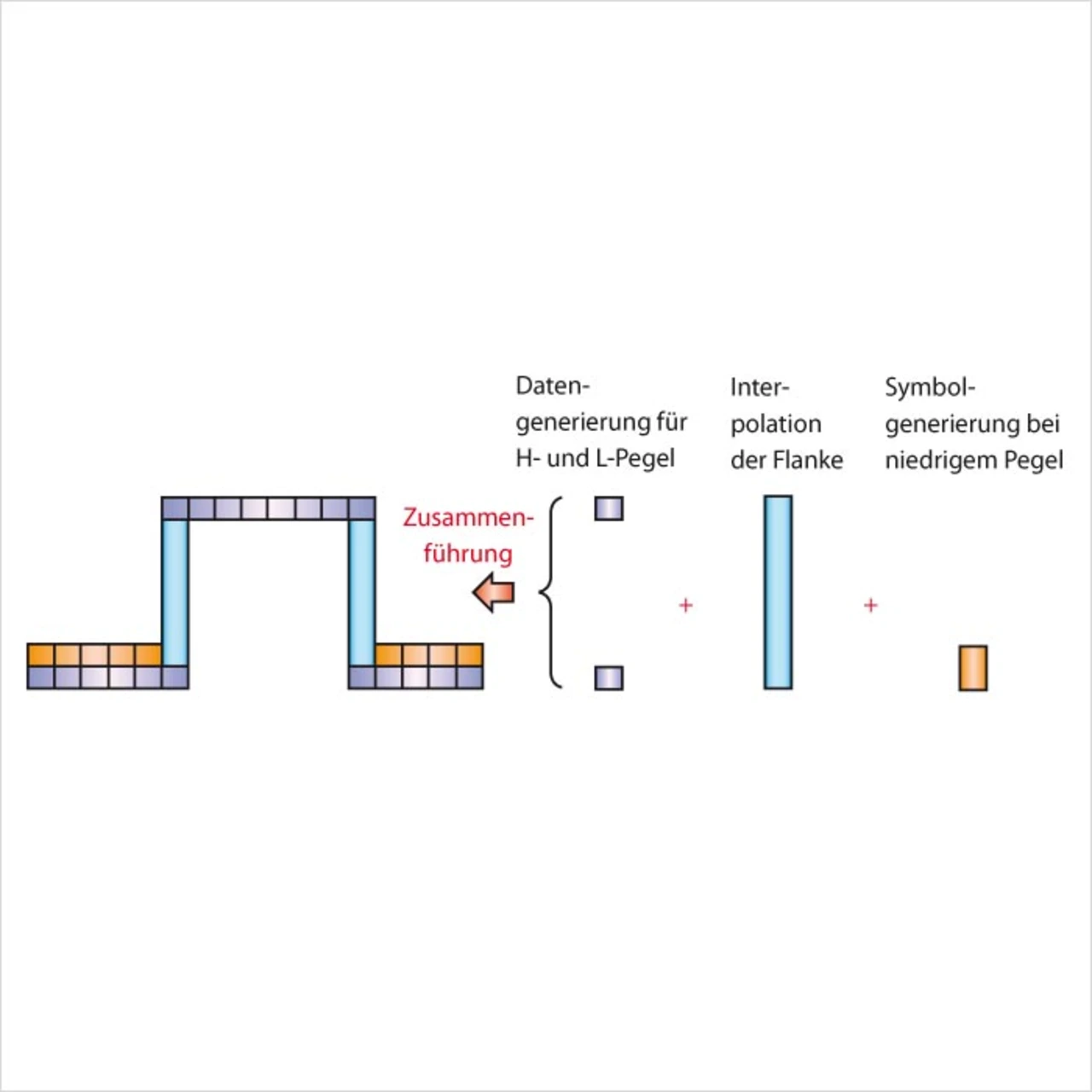 Die Hardware des Oszilloskops setzt die Logikpegel-Darstellung aus den erfassten Low-Pegeln und den erfassten High-Pegeln zusammen, wobei die ansteigenden und abfallenden Flanken aus den Übergängen zwischen High-Low automatisch interpoliert werden (Bild 4). Das Ende eines Low-Pegels und der Beginn eines High-Pegels bedeuten z.B., dass hier auch eine ansteigende Flanke darzustellen ist.