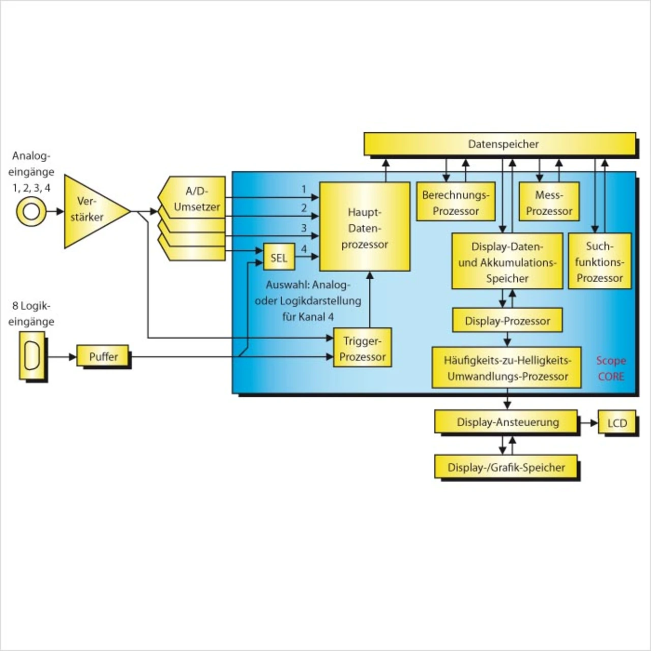 Übliche 4-Kanal-Oszilloskope bieten zu wenig Kanäle für bestimmte Anwendungen, z.B. für eine umfassende Diagnose an einem SPI-Bus (drei Leiter oder vier Leiter), zur Beobachtung der analogen und digitalen Ansteuersignale eines Motorantriebs in den verschiedenen Stufen eines Motortreiber-Systems oder zur Darstellung der Zeitverhältnisse zwischen digitalen Steuersignalen und analogen Sensorik-Signalen der elektronischen Steuereinheit (ECU) eines Automobils.