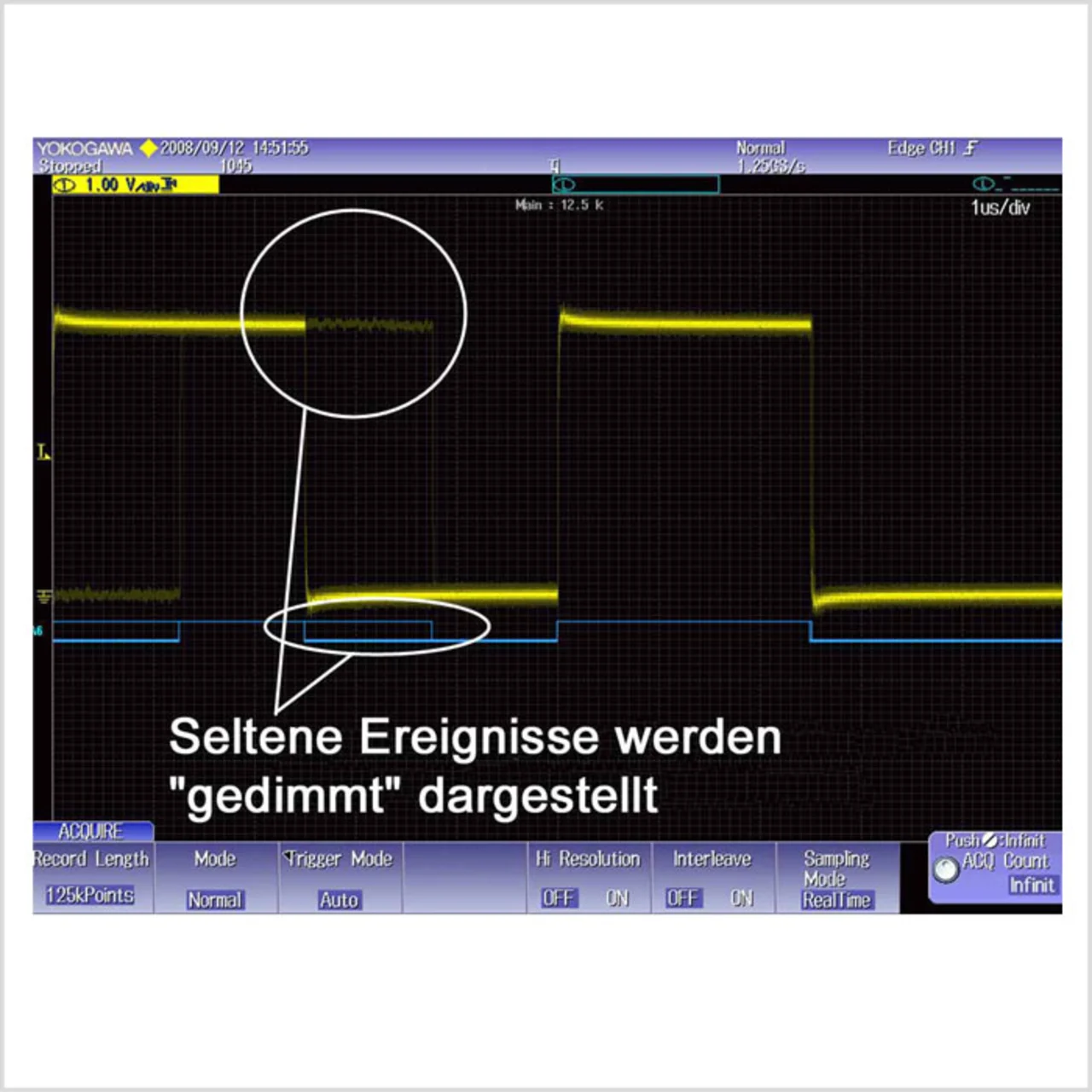 Der ScopeCORE-Prozessor erledigt bei dem neuen Oszilloskop die Umschaltung der Analog- und Logik-Eingangssignale direkt im Funktionsblock für die Datenakquisition. Da die erfassten max. acht Logikpegelsignale im Analogkanal 4 gespeichert und weitergeleitet werden, bleibt auch bei Anzeige von Logikdaten die hohe Kurvenakquisitionsrate wirksam, so dass seltene Ereignisse nicht ausgelassen werden (Bild 3). Ebenso können die Logikpegelsignale direkt auf dem Bildschirm den Analogsignalen überlagert werden, so dass die Zeitverhältnisse zwischen Analog- und Logiksignalen unmittelbar erkennbar sind.