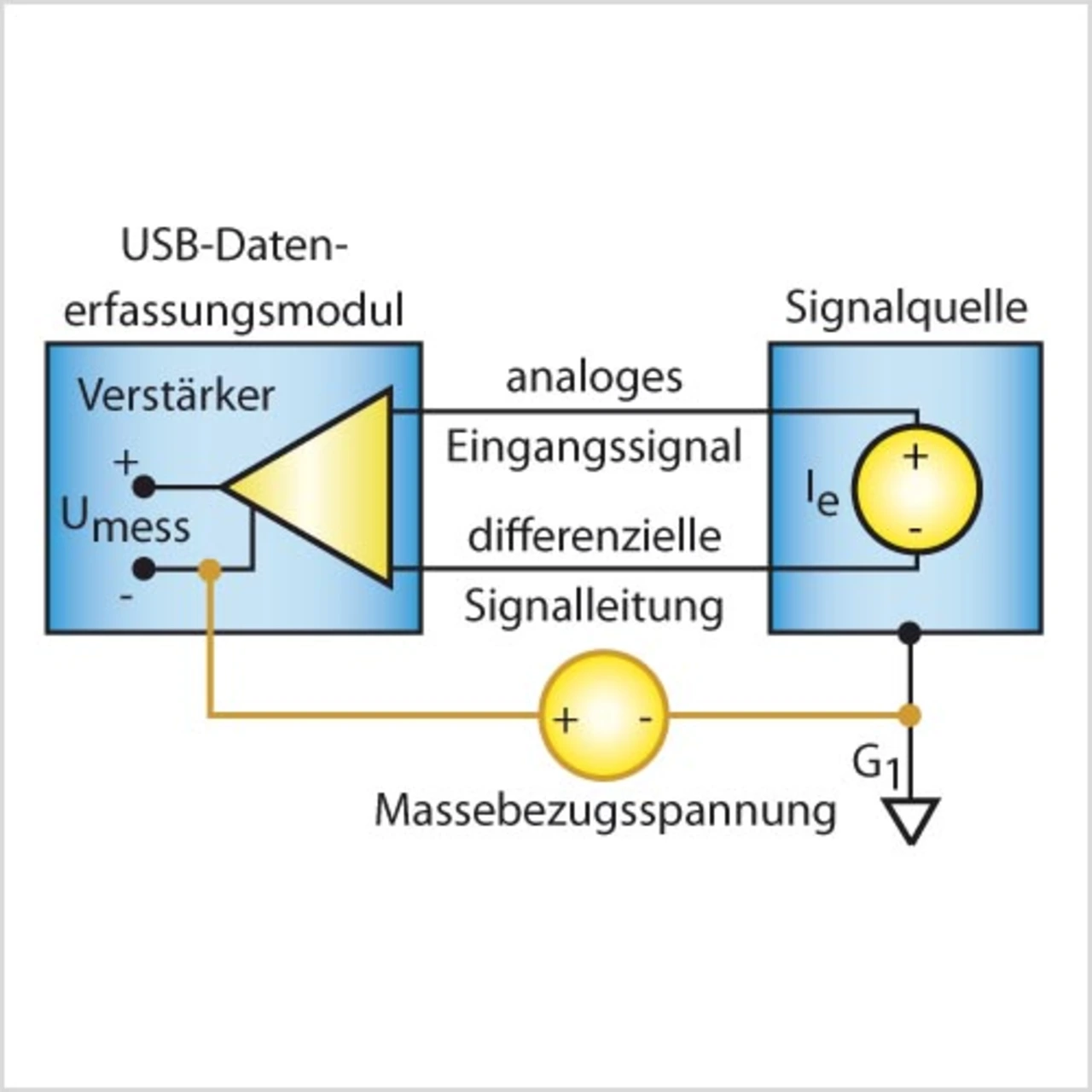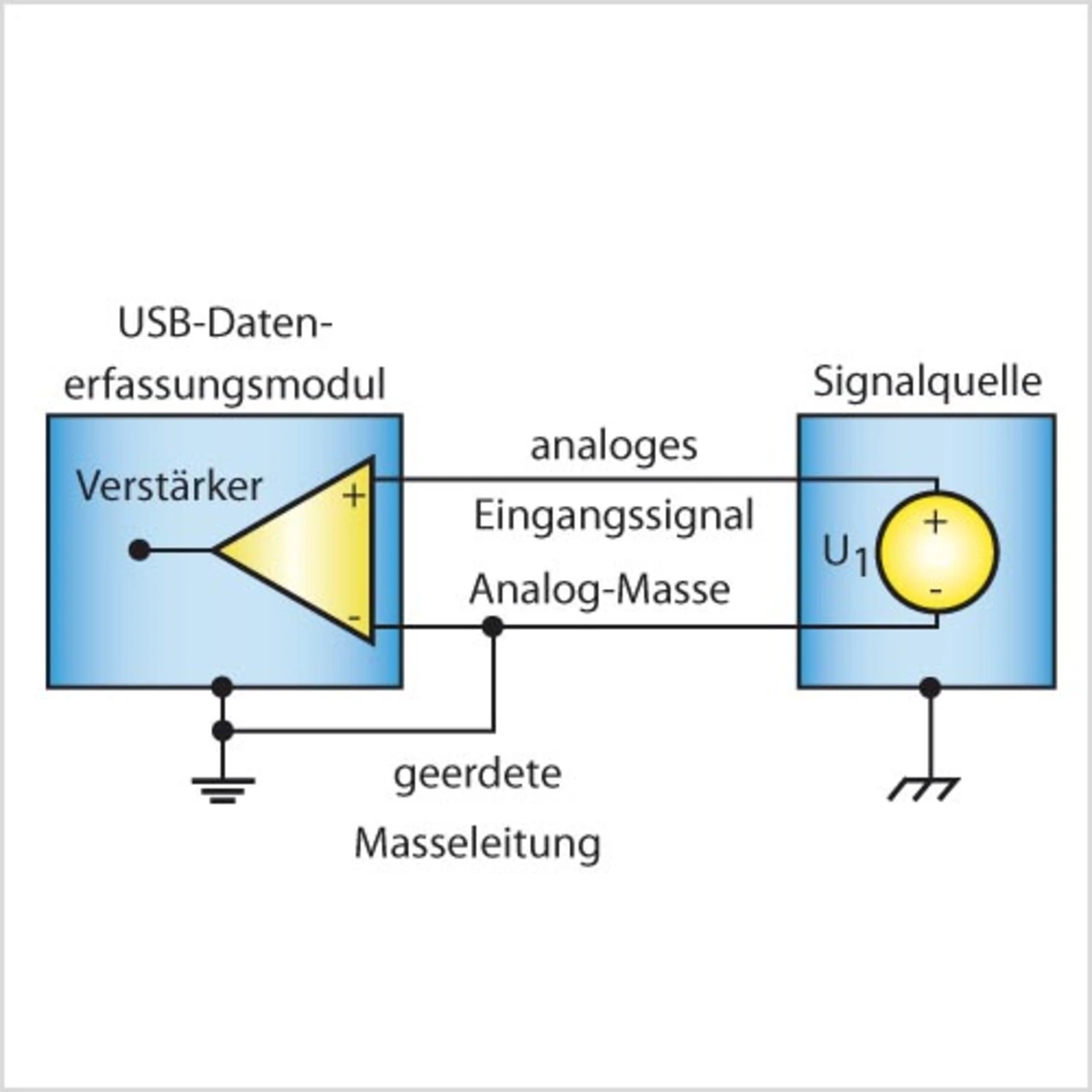 Obwohl das zu messende System auf dem gleichen Massepotential wie das USB-Datenerfassungsmodul liegt (da beide über das Stromleitungsnetz des Gebäudes verbunden sind), kann das Massepotential zwischen den beiden Geräten eine beträchtliche Spannungsdifferenz aufweisen – über 100 mV. Schnelle Schaltströme erfordern dann einen schnellen Ausgleich über das 5 Meter lange USB-Kabel bis zum PC. Je nachdem, wie die unsymmetrischen Eingänge des Moduls angeschlossen sind, können sich auch Fehler durch Masseschleifen ergeben. Dabei können Spannungsdifferenzen auf den Signalleitungen oder dem Massepotential des USB-Kabels zu sehr ungenauen Messungen führen oder sogar das System beschädigen. Bild 3 zeigt ein Beispiel für einen unsauberen Anschluss eines unsymmetrischen Eingangs. Eine bessere Möglichkeit, unsymmetrische Eingänge anzuschließen, ohne dass derartige Fehler durch Masseschleifen auftreten, ist in Bild 4 dargestellt.