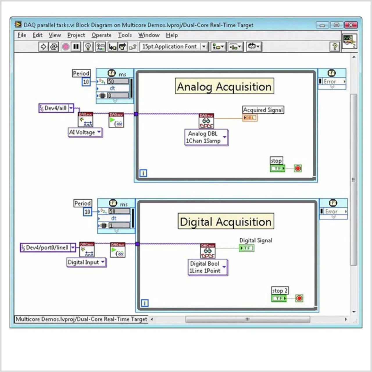 Der Parallelismus, der beispielsweise der Entwicklungsumgebung LabVIEW aufgrund des Datenflussparadigmas zugrundeliegt, verschafft Anwendern von Multicore-Prozessoren einen Vorteil und überwindet die Komplexität traditioneller textbasierter Programmiersprachen (Bild 1). Darüber hinaus wurde diese Entwicklungsumgebung in der neuesten Version um Funktionen ergänzt, die eine gezielte Nutzung und Verwaltung der Ressourcen von Multicore-Systemen ermöglichen.