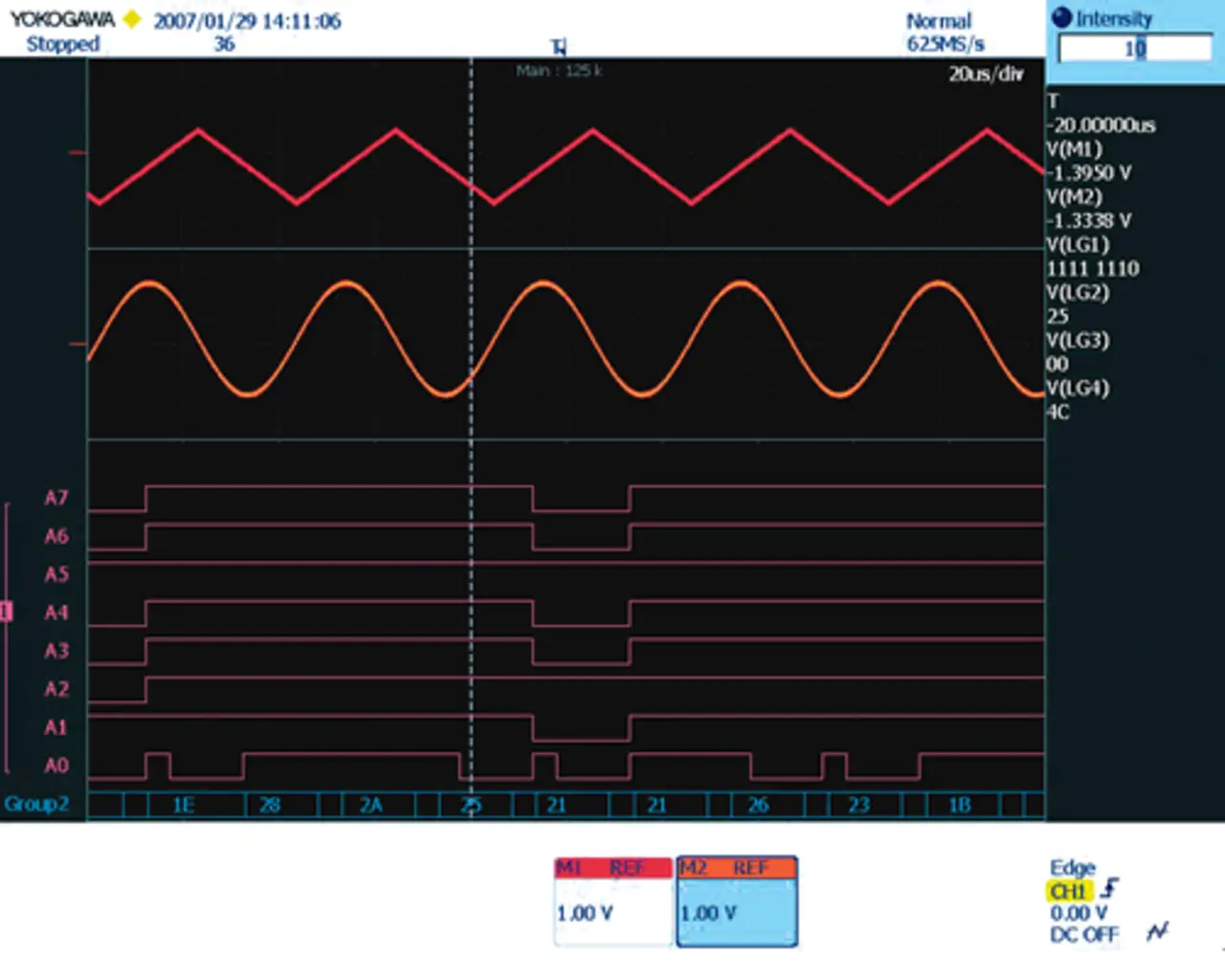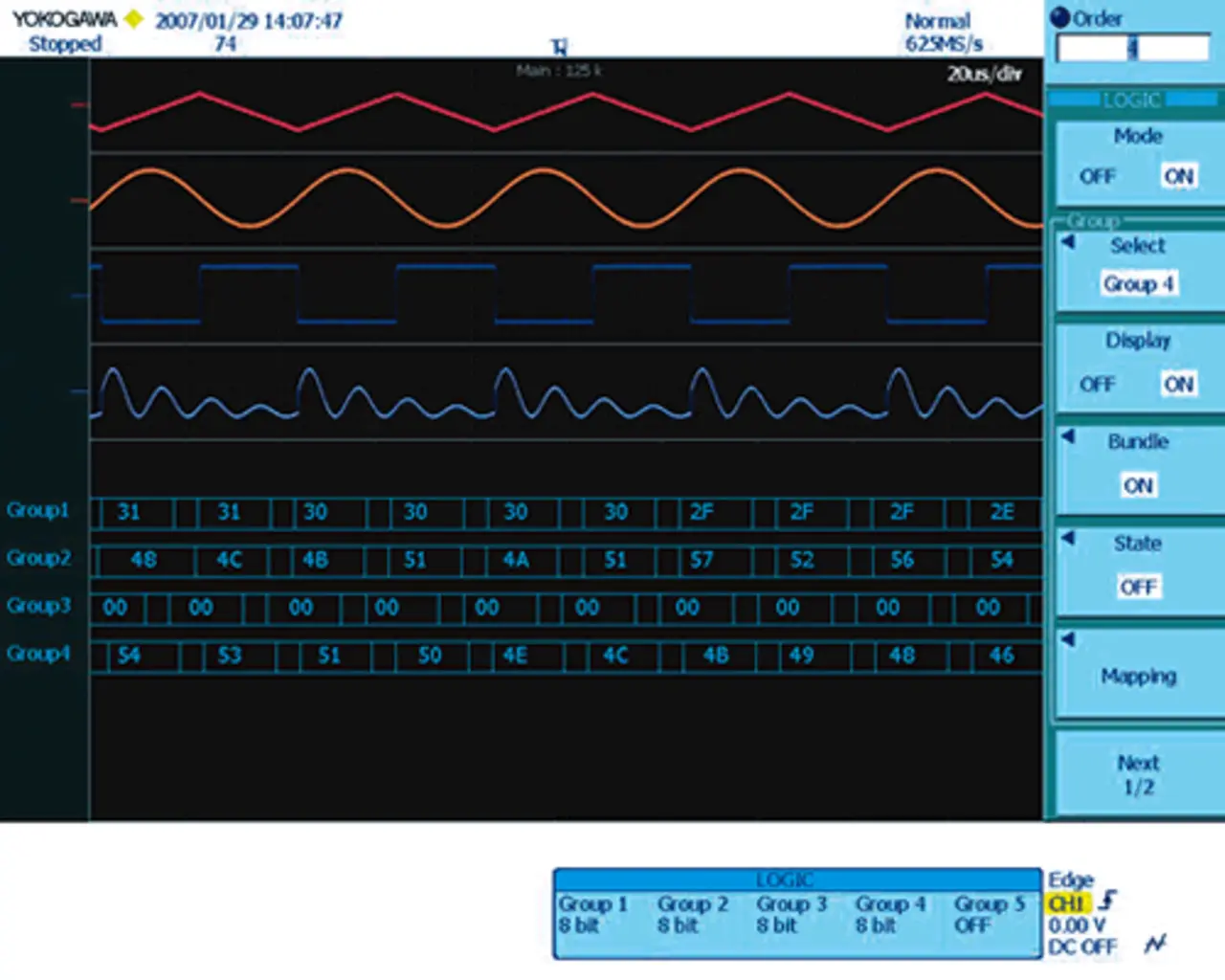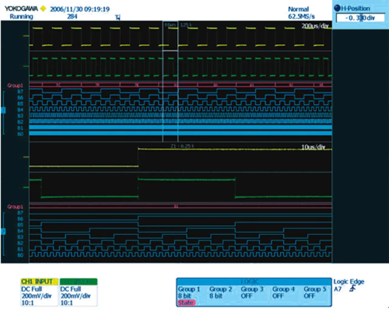 Das nun von Yokogawa entwickelte neue MSO namens DL9710L geht auf die erweiterten Anforderungen ein; es kombiniert 32 Logikeingänge mit vier 1-GHz-Analogeingängen (Abtastrate 5 GS/s) in einem Messgerät. Alle Kanäle – sowohl analoge als auch digitale – bieten eine Speicherkapazität von jeweils 6,25 MWorten. Diese Kanal-Speicherkapazität ist unabhängig von der Anzahl der wirklich benutzten Kanäle. Zudem ist die Signalverarbeitungsgeschwindigkeit der analogen Kanäle nicht durch die Anzahl der benutzten digitalen Kanäle beeinträchtigt. Die Kurvenformen der in den vier Analogkanälen erfassten Signale können auf dem auch unter ungünstigen Lichtverhältnissen gut ablesbaren Bildschirm zusammen mit den Pegeldarstellungen der Logikkanäle frei gruppiert und mit zahlreichen Zoom- und Suchfunktionen analysiert werden. Eine tiefgehende Analyse von analogen Kurvenformen mit Messwerten und gleichzeitig digitaler Logikanalyse ist damit auf eine praxisgerechte Art übersichtlich durchführbar (Bild 1).