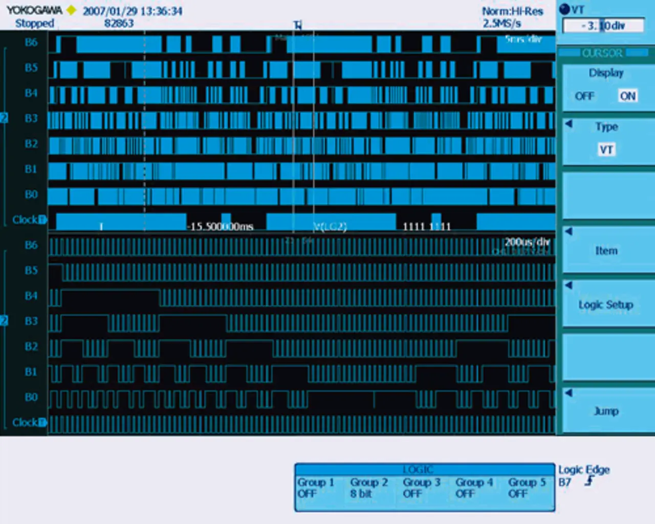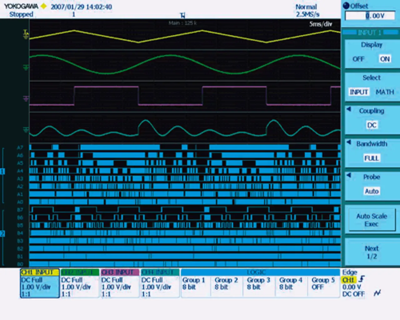 Für all diese Funktionen und insbesondere für die komplexe Signaldarstellung ist im Scope eine beachtliche Prozessorleistung notwendig. Selbst bei zugeschalteten Mess- oder Mathematikfunktionen umfassender Art bleibt die Bildschirm-Aktualisierung im Millisekunden-Bereich. Dies ist gerade bei der Darstellung einer großen Anzahl von gemischten Signalen wichtig, da hier die Analyse naturgemäß mehr Zeit erfordert und deshalb ein schnelles MSO wünschenswert ist.