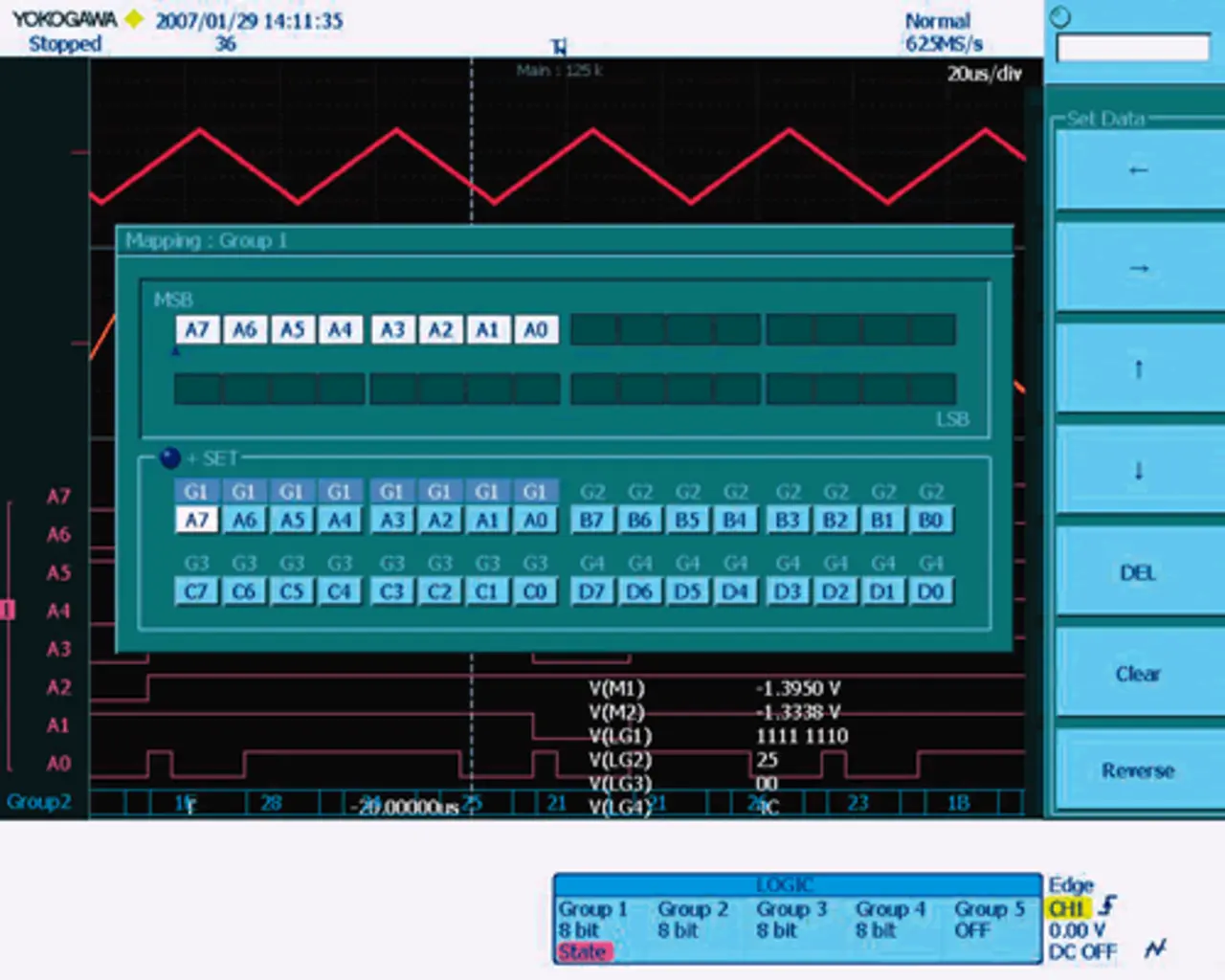 Sind 32 digitale Eingänge über den Logiktastkopf angeschlossen, lassen sich deren Signalzustände mit einem Tastendruck auf den Bildschirm holen. Danach kann der Anwender die Bussignale sinnvoll per Menü in Gruppen beliebig zuordnen und zutreffende Namen vergeben (Bild 2). Der Anwender wird dadurch vom lästigen Wechseln von Pinbelegungen befreit, denn die einzelnen Bussignale sind per Menü auch in der Reihenfolge tauschbar, was insbesondere dann hilfreich ist, wenn Signale mit einem direkten gemeinsamen Bezug analysiert werden sollen oder wenn die Pinbelegung geändert werden muss.