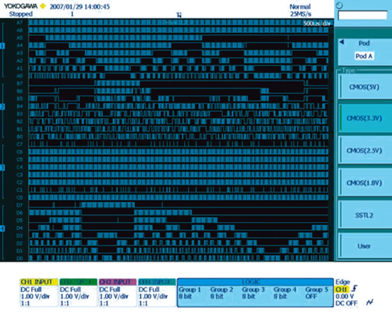 Die bis zu fünf Gruppen können einzeln zu- oder abgeschaltet werden. Der Anwender kann dann einfach von einer kompletten Übersichts- zu einer Detaildarstellung wechseln (Bild 3 und Bild 4); eines oder zwei Zoomfenster sind bei Bedarf zuschaltbar. Besonders nützlich ist die klare Bildschirmwiedergabe selbst in der 32-bit-Timing-Darstellung, wie in Bild 3 gezeigt. Hier macht sich das XGA-Display mit einer Auflösung von 1024 x 768 Punkten in Bezug auf Kontrast und Ablesegenauigkeit positiv bemerkbar.