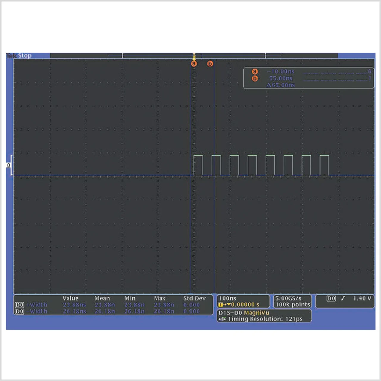Das TTL-Burstsignal wird auf einen der digitalen Kanäle des Mixed-Signal-Oszilloskops gelegt, der Schwellenwert entsprechend der TTL-Logik eingestellt und der Trigger auf die steigende Flanke gesetzt. Um die Überprüfung möglichst schnell durchzuführen, wird das MSO so konfiguriert, dass die Breiten der positiven und negativen Impulse zwischen den Cursorpunkten automatisch gemessen werden.