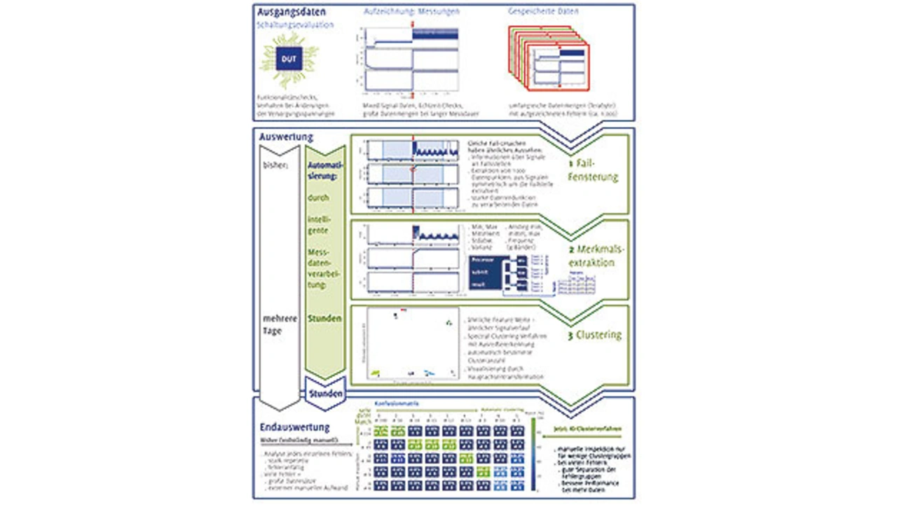Ob neu entworfene integrierte Schaltungen funktionieren und sich somit in Masse produzieren lassen, wird mit definierten Charakterisierungs- und Testverfahren untersucht. Dafür gibt es bei Mixed-Signal-Chips und MEMS bereits automatisierte Test-Set-ups, um die spezifizierten Betriebsbedingungen zu überprüfen. Wenn jedoch identifiziert werden soll, wo und wie die Chips zu versagen beginnen, müssen Testabläufe außerhalb dieser Spezifikation erfolgen. Dabei entstehen umfangreiche Messdaten. Diese enthalten meist eine große Anzahl potenzieller Fehler, die individuell und vor allem manuell untersucht werden müssen, was sehr zeit- und kostenintensiv ist. Für derartige Testdatenanalysen außerhalb der Spezifikation haben IMMS und die TU Ilmenau eine neue Methode auf Basis von Machine-Learning-Algorithmen entwickelt. Damit lassen sich ähnliche Fehlerbilder- und Ausfallszenarien automatisch gruppieren.