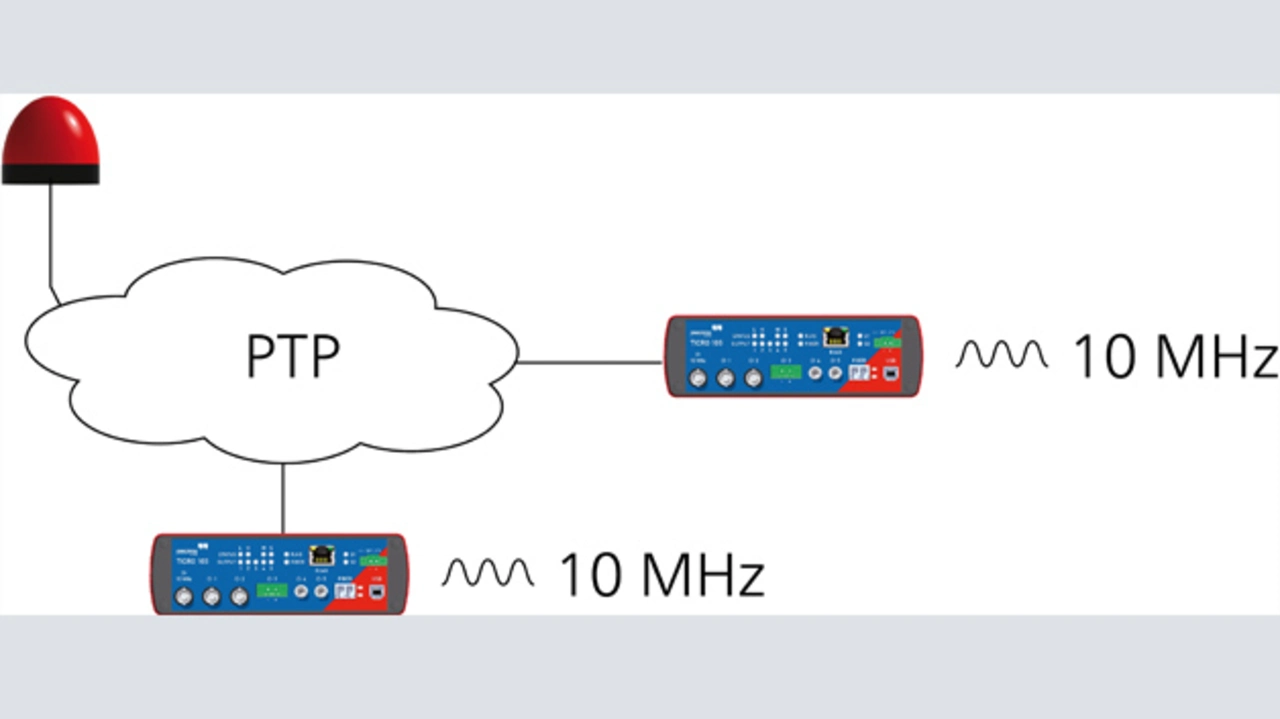 Eine weitere Besonderheit des Ticro ist die Möglichkeit, aus dem empfangenen Zeitsignal eine genaue 10-MHz-Referenzfrequenz zu generieren, die beispielsweise in Elektroniklabors für die Synchronisation von Messgeräten benötigt wird. Für verschiedene Aufgaben ist es zwingend erforderlich, Messgeräte wie Frequenzzähler oder Spektrum-Analysatoren an ein genaues Referenzsignal anzubinden. Deswegen ist an solchen Geräten ein 10-MHz-Eingang vorhanden. Erst durch diese Anbindung des Gerätes ist sichergestellt, dass aussagekräftige Messungen vorgenommen werden können. Bislang wird die 10-MHz-Referenz in vielen Labors über Koaxialkabel verteilt, ein hohet Installationsaufwand. Mit dem Ticro kann das über Ethernet verteilte PTP-Signal genutzt werden. Das hat einen entscheidenden Vorteil: Wo auch immer ein 10-MHz-Referenzsignal benötigt wird, kann der Ticro 100 einfach an der nächsten Netzwerkdose angeschlossen werden.