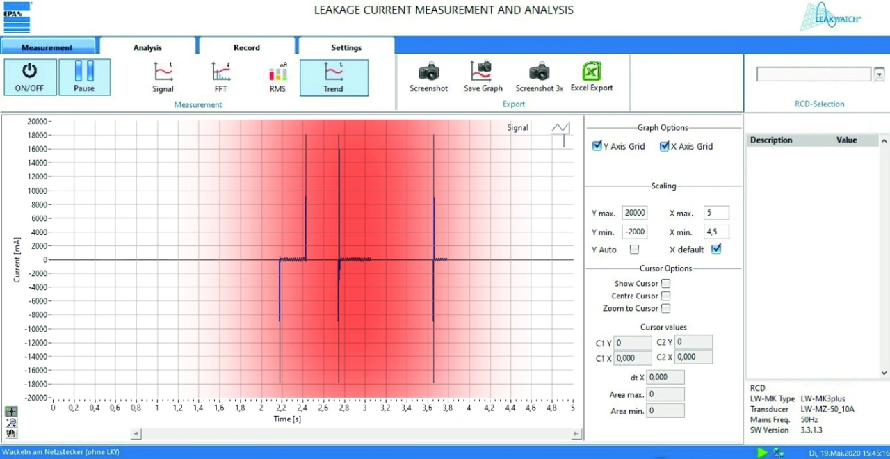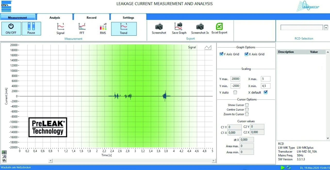 Üblicherweise würde man für die Messung des Differenzstroms zu einer Strom- oder Leckagezange greifen. Weil Messzangen aber nur einen Istwert anzeigen, der einer gewissen Trägheit unterliegt, ist es mit ihnen nicht möglich, der Ursache der Auslösung im Moment des Kontaktherstellens von Stecker oder Schalter näher zu kommen. Ein geeignetes Mittel für solch eine Messung wäre ein Oszilloskop mit passender Messzange – hier ist der Messaufbau allerdings vergleichsweise aufwändig. Deutlich einfacher geht es mit dem Mess- und Analysesystem Leakwatch von EPA – es verfügt über eine sogenannte Trigger-Funktion, mit der eben jener Auslösemoment aufgezeichnet und im Anschluss analysiert werden kann.