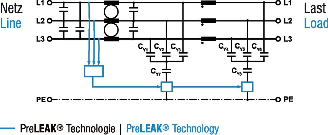 Die in den Netzfiltern der Baureihe EPA NF-KC-LKY integrierte PreLeak Technology ist eine Entwicklung von EPA. Mit dieser weltweit einmaligen Technologie ist es gelungen, eine komplett neue Generation von Netzfiltern zu entwickeln, die weder beim Zu- noch beim Abschalten einen Differenzstromimpuls erzeugen. Sporadisch auslösende Fehlerstrom-Schutzschalter gehören mit diesen der Vergangenheit an, und dem gefürchteten „Klack!“ wird ein großer Teil seines Schreckens genommen.