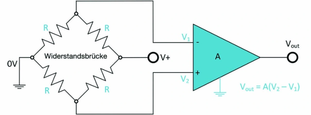 Die Wheatstone- oder Widerstandsbrücke eignet sich für eine ganze Reihe von Anwendungen. Außerdem kann diese Schaltung mit modernen Operationsverstärkern verwendet werden, um verschiedene Wandler und Sensoren an diese Verstärkerschaltungen anzuschließen. Die Wheatstonebrücke findet häufig Anwendung in elektronischen Schaltungen, die über das Vergleichen eines unbekannten Widerstands mit einem bekannten Widerstand hinausgehen. Eine Wheatstonebrücke hat jeweils zwei Eingangs- und Ausgangsanschlüsse, die aus vier Widerständen in einer rautenförmigen Anordnung bestehen (Bild 3). Bei der Verwendung von Operationsverstärkern, kann die Wheatstonebrückenschaltung genutzt werden, um kleine Widerstandsänderungen zu messen und zu verstärken. Durch Verwendung von Ultrapräzisionswiderständen lässt sich die Brücke im Vergleich zu herkömmlichen Dünnfilmwiderständen viel genauer ausgleichen. Jeder der vier Widerstände ist aktiv. Somit ist es für den Brückenausgleich und deren Stabilität sehr wichtig, die Widerstände aufeinander abzustimmen.