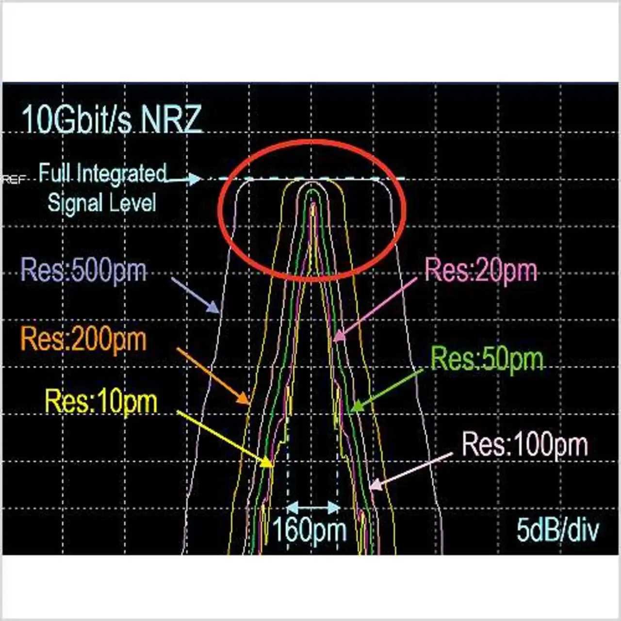 Eine wichtige Aussage zur Qualität von Übertragungssystemen trifft die OSNR-Messung. Dabei wird das Verhältnis der Leistung des Signals zur Rauschleistung ermittelt. Da die Energie des Lasers bei hochbitratigen Systemen aber nicht der Spitzenleistung entspricht, die mit hochauflösendenen Spektrumanalysatoren gemessen wird, braucht man ein spezielles Messverfahren. Yokogawa-Analysatoren bieten hierfür eine Funktion, die es erlaubt, die Signalleistung mit einer groben Auflösung (bei 10 Gbit/s-NRZ-Signalen mit 0,2 nm) exakt zu bestimmen und dann die Rauschleistung mit einer hohen Auflösung zu ermitteln.