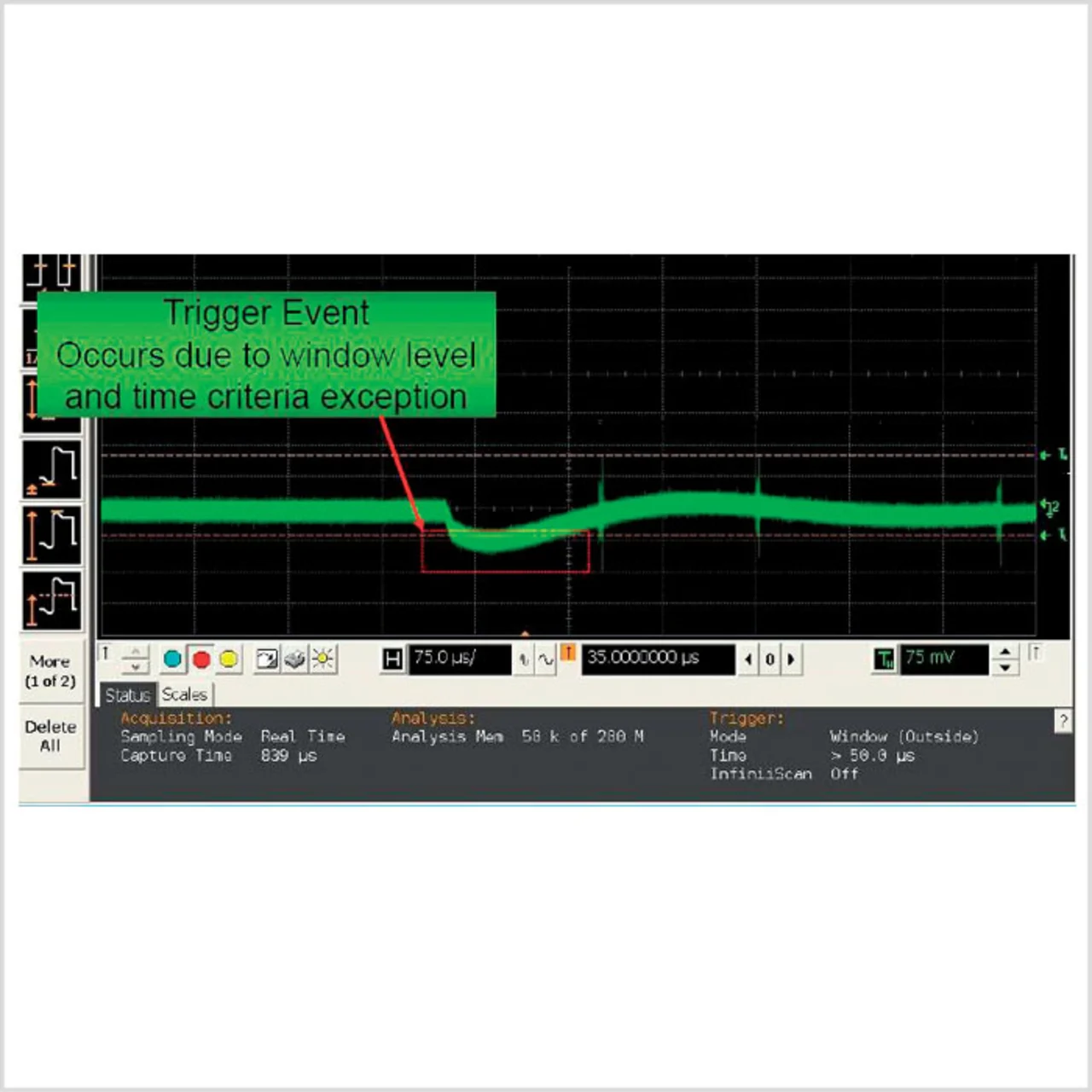 Fenstertriggerung definiert ein Fenster auf dem Oszilloskop. Dabei stellen die Fenstergrenzen einen unteren und einen oberen Spannungsschwellwert sowie einen unteren und einen oberen zeitlichen Grenzwert dar. Das Oszilloskop triggert, wenn die Kurve ins Fenster eintritt, wenn sie es verlässt oder wenn sie für eine zu lange oder zu kurze Zeit innerhalb oder außerhalb des Fensters verläuft. Mit diesem Trigger lassen sich jegliche Störspannungen auf dem Bus ausblenden, sodass man gezielt lang dauernde (Transienten-) Effekte betrachten kann. Bild 2 zeigt ein Beispiel einer Kurve, bei der die Fenstertriggerung den interessierten längeren Einbruch erfassen kann, während die hochfrequenten Störspannungen andere Trigger längst auslösen würden.