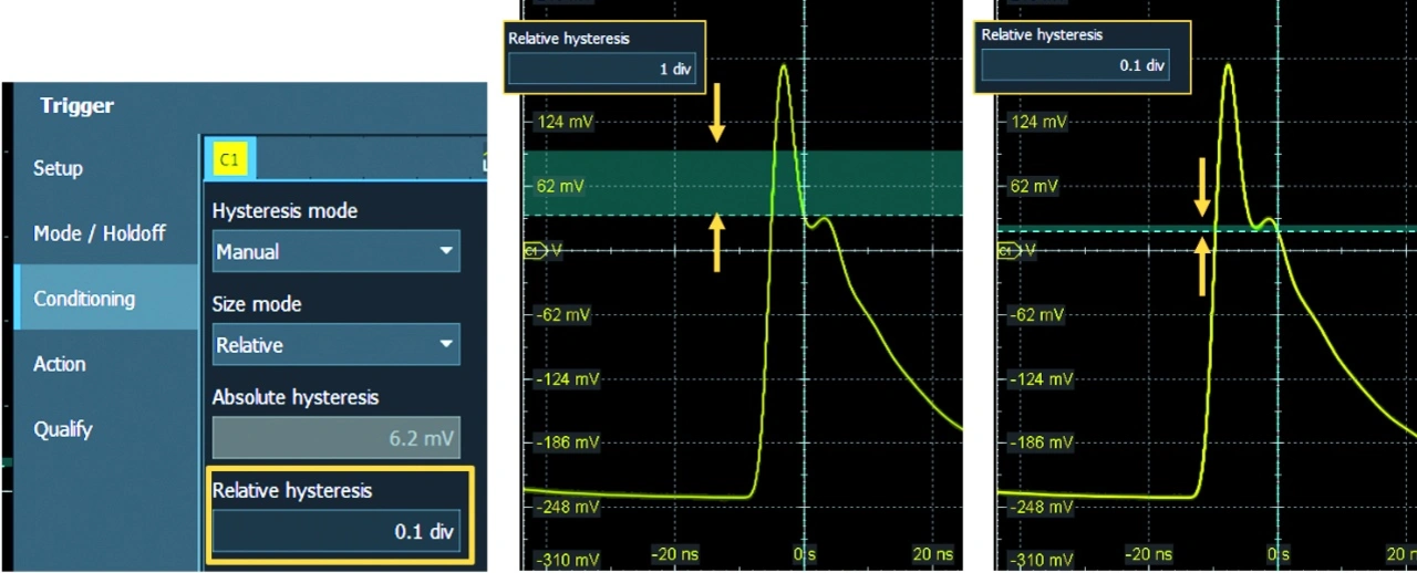 Ein weiterer Vorteil der Digitaltechnik betrifft die Trigger-Hysterese. Oszilloskope mit digitaler Triggerung lassen die Einstellung der Trigger-Hysterese durch den Benutzer zu. Der Benutzer kann also festlegen, welche Hysterese das Oszilloskop anwenden soll, um zwischen Rauschen und echten Signalübergängen zu unterscheiden. Ein Beispiel hierfür ist in Bild 3 dargestellt, wo auf dem Oszilloskop-Display eine Hystereselinie zu sehen ist, die dicker wird, wenn der Benutzer eine größere Hysterese anwendet, und dünner, wenn ein kleinerer Hysteresewert gewählt wird. Hier hat der Benutzer die Wahl: Bei einer Hysterese von 1 Div wird auf die fallende Flanke des größeren Impulses getriggert, während bei einer Hysterese von 0,1 Div der digitale Trigger auf die sehr kleine fallende Flanke des kleinen Impulses anspricht. Es kann sehr hilfreich sein, mit dem Signal auch eine visuelle Darstellung der Trigger-Hysterese zu erhalten, insbesondere bei rauschbehafteten Signalen. Bei Oszilloskopen mit analoger Triggerung ist ein Hysteresewert fest in den analogen Schaltkreis integriert und kann vom Benutzer nicht geändert werden. Daher sind Oszilloskope mit digitaler Triggerung unter dem Aspekt der Trigger-Hysterese vorzuziehen.