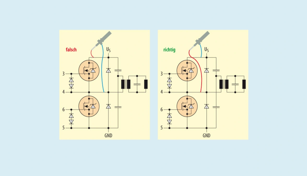 Für qualitativ hochwertige Messungen an Leistungselektronik sind nicht nur das richtige Messgerät und der richtige Tastkopf notwendig, sondern es muss auch ein besonderes Augenmerk auf die richtige Kontaktierung gelegt werden. Für eine Messung mit einem Oszilloskop mit isolierten Eingangskanälen bieten sich passive Tastköpfe an. Entscheidend dabei ist eine möglichst kurze Kontaktierung der Signal- und Masseverbindung, um Überschwingen (Ringing) zu minimieren und eine möglichst große Gleichtaktunterdrückung zu erreichen.