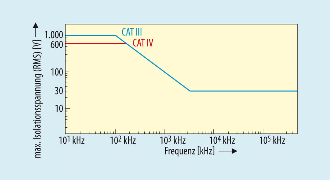 Wandler für elektrische Antriebe arbeiten typischerweise mit Taktfrequenzen im Bereich von 10 kHz bis 100 kHz. Entscheidend für eine sichere Messung an diesen Wandlern ist nicht nur die Maximalspannung des Messsystems, sondern auch das sogenannte »Derating« über die Frequenz (Bild 3). Mit zunehmender Frequenz verringert sich die maximal erlaubte Spannung am Messeingang oder zwischen Massepotenzial des Messsystems und Erdpotenzial. Wird diese überschritten, kann es zu einer Gefährdung für den Anwender kommen. Der R&S Scope Rider erlaubt eine Messung mit voller Signalamplitude bis zu 100 kHz und ist somit für diese Anwendung gut geeignet.