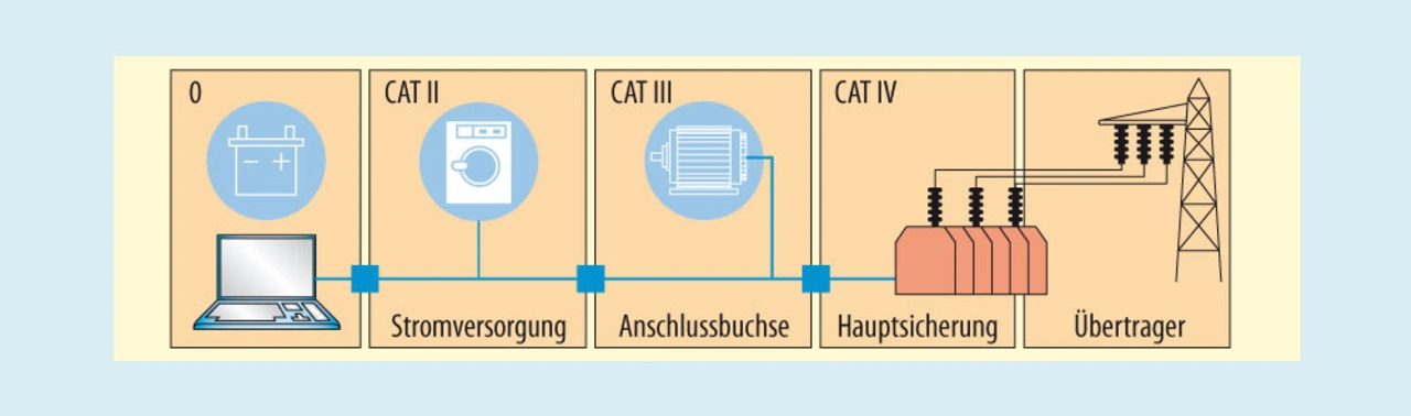 Ist das Testobjekt zusätzlich an die elektrische Installation angeschlossen, muss auch die Messkategorie beachtet werden. Abhängig davon, an welcher Stelle der elektrischen Installation das Testobjekt angeschlossen ist, muss das Messsystem unterschiedlich große Spannungsspitzen am Eingangskanal erlauben, ohne die Sicherheit des Anwenders durch Überschläge oder Kurzschlüsse zu gefährden (Bild 4). Je näher man sich am Hausanschluss der elektrischen Installation befindet, umso größere Spannungsspitzen können auftreten und entsprechend größer ist die geforderte Überspannungsfestigkeit. Mit einem isolierten Oszilloskop der Kategorie 4 (CAT IV Rating) ist man auf der sicheren Seite. Beim R&S Scope Rider bedeutet das eine Überspannungsfestigkeit bis 8.000 V und damit eine Eignung für 600 V (RMS) in einer CAT-IV-Umgebung oder 1000 V (RMS) in einer CAT-III-Umgebung.